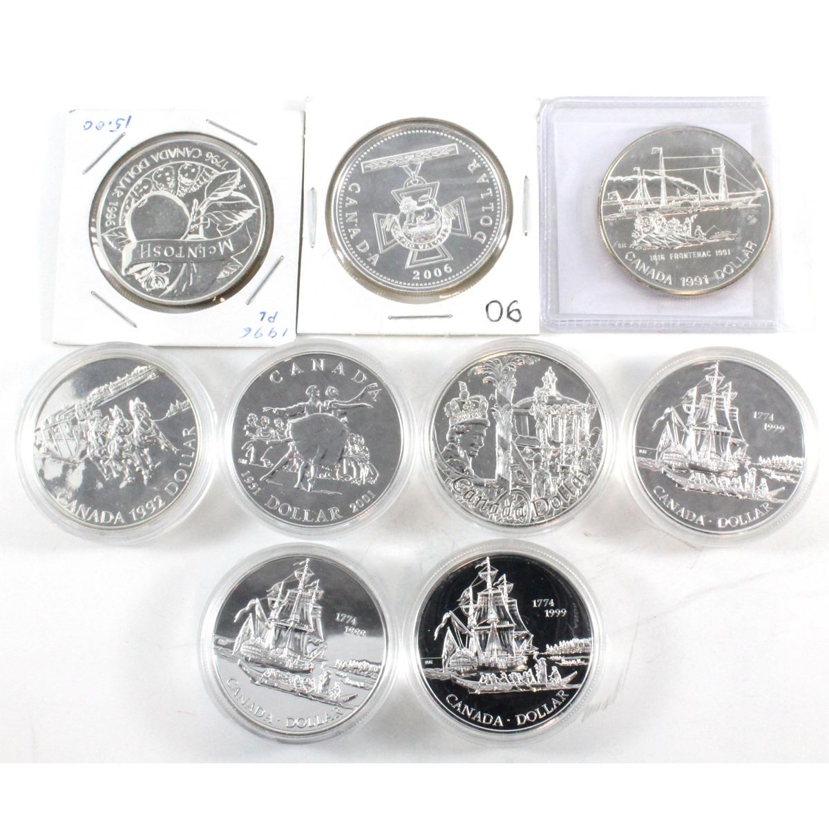 Estate Lot of 9x Canadian Silver Dollars 1991-2006. You will receive the following dates of Canadian Silver Dollars: 1991, 1992, 1996, 3x 1999, 2001, 2002, and 2006. (9pcs) Buyers Premium will be added on all items as per our terms of sale. We accept Paypal, Credit Card, E-Transfer Payments, Cheque or Money Orders (there is an additional 3% fee for using Paypal or Credit Card). All invoices will be emailed immediately following the auction, please contact us if you would like to pay by credit card or receive a new revised lower total for mailing in payment or sending an e-transfer (3% discount). All Items Are Sold "AS IS", no returns