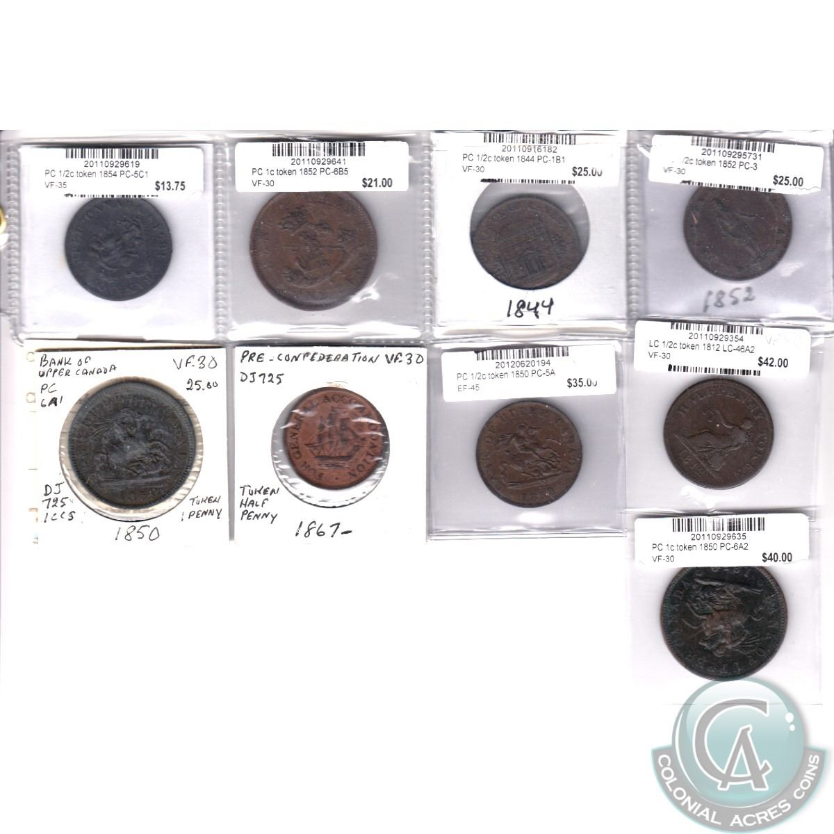 Estate Lot of 9x Various Canadian Half Penny and Penny Bank Tokens from Upper Canada, Bank of Montreal, Quebec Bank Dated 1812-1854. One of the tokens comes with an ICCS certification card of VF-30. 9pcs