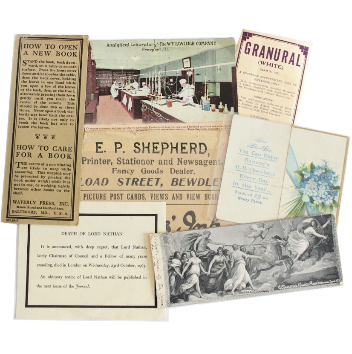 Estate Lot of Antique Ephemera. In this collection you will receive Advertisements, Greeting Cards, Prayer Cards, and a Death Notice for Politician Lord Harry Nathan etc. 13pcs.
