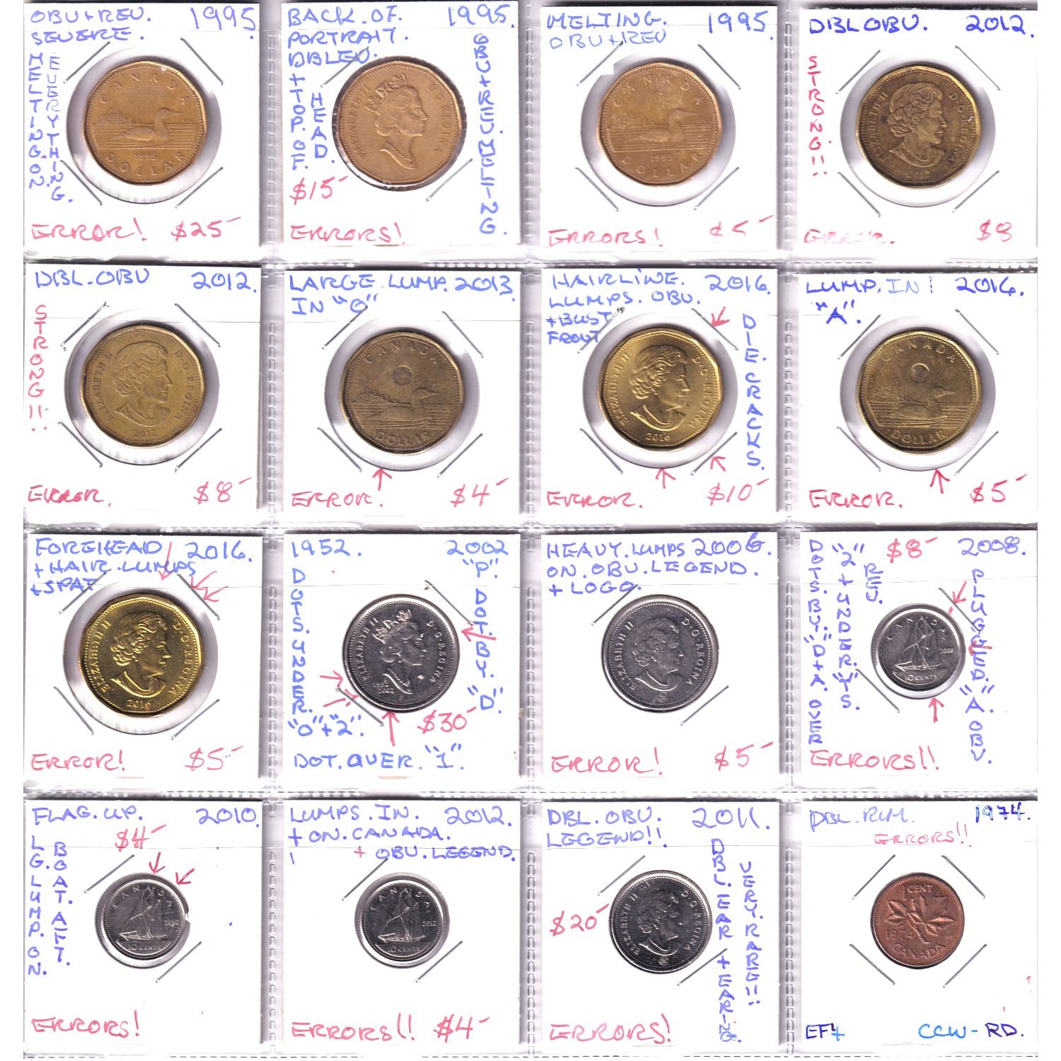 Estate Lot of Assorted Canada 'Error' Coins - 1-cent, 5-cent, 3x 10-cent, 2x 25-cent & 9x Loon $1. All errors listed on holders. 16pcs