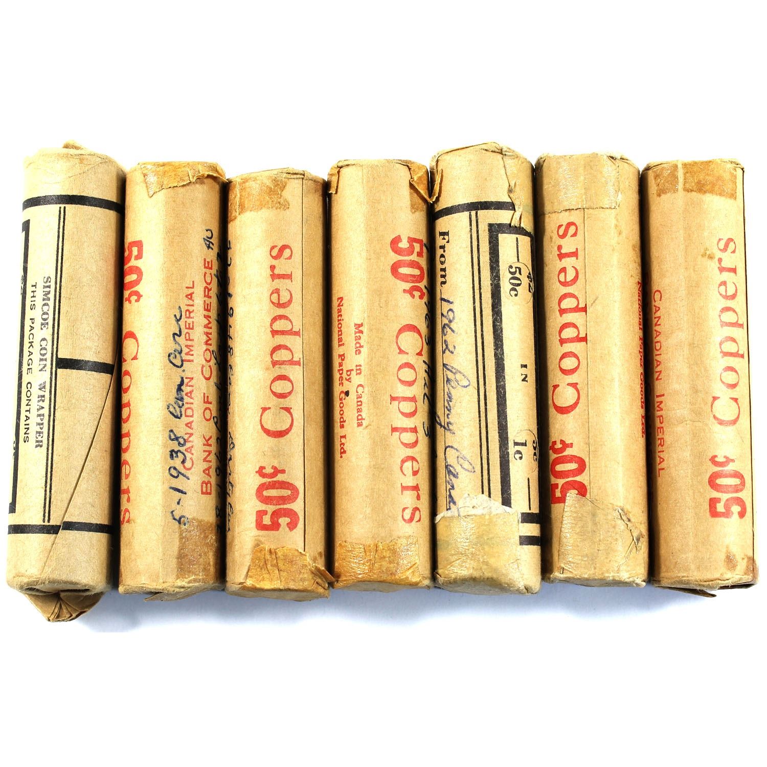 Estate Lot of Canada Mixed Dated 1-cents in Rolls of 50 coins. Dates includes 1938, 1948, 1962 & 1963 (mostly 1962). 7pcs