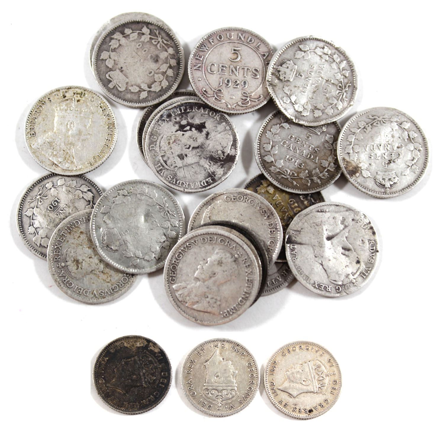 Estate Lot of Canada/NewFoundland Silver 5-cents & 10-cents. Lot includes 5-cents dated between 1880's - 1919, NFLD 5-cents 1908 & 1929, 10-cents all NFLD 2x 1941 & 1943. 20pcs