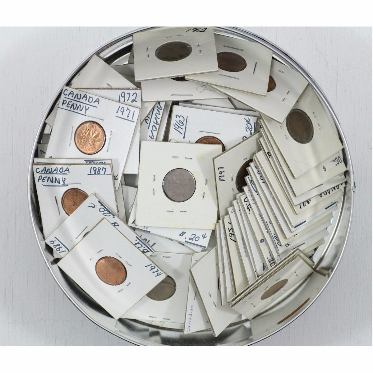 Estate Lot of Canada Pennies from the 1940's and up in a tin can. Sold as is.Buyers Premium will be added on all items as per our terms of sale. We accept Paypal, Credit Card, E-Transfer Payments, Cheque or Money Orders (there is an additional 3% fee for using Paypal or Credit Card). All invoices will be emailed immediately following the auction, please contact us if you would like to pay by credit card or receive a new revised lower total for mailing in payment or sending an e-transfer (3% discount). All Items Are Sold "AS IS", no returns