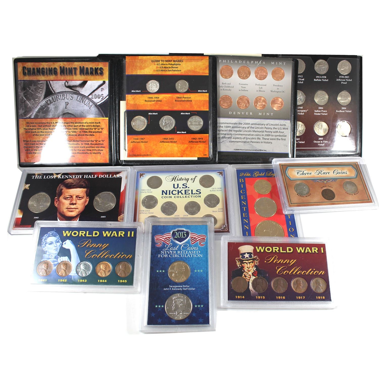Estate Lot of Commemorative USA Coin Sets. You will receive 'Changing Mint Marks' 5-coin set, 'Lincoln Penny Collection' 8-coin, '100 Years of American Nickels' 9-coin, WWII Penny Collection 5-coin, 'The Lost Kennedy Half Dollars' 2-coin, WWI Penny Collection 5-coin, 'History of US Nickels' 8-coin, 2013 Lost Coins Never Released for Circulation 2-coin, 24kt Gold Layered Bicentennial Collection 3-coin & 'Three Rare Coins' 3-coin. Sets come in hard plastic holders or folders. 10 sets.