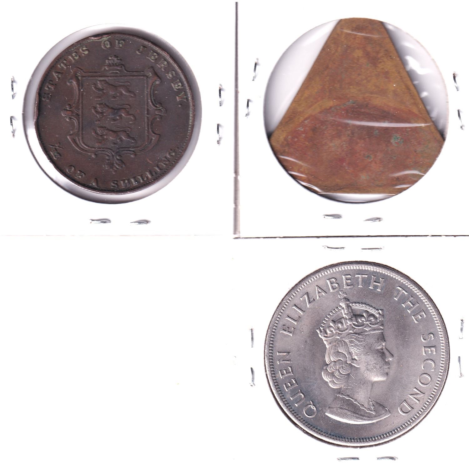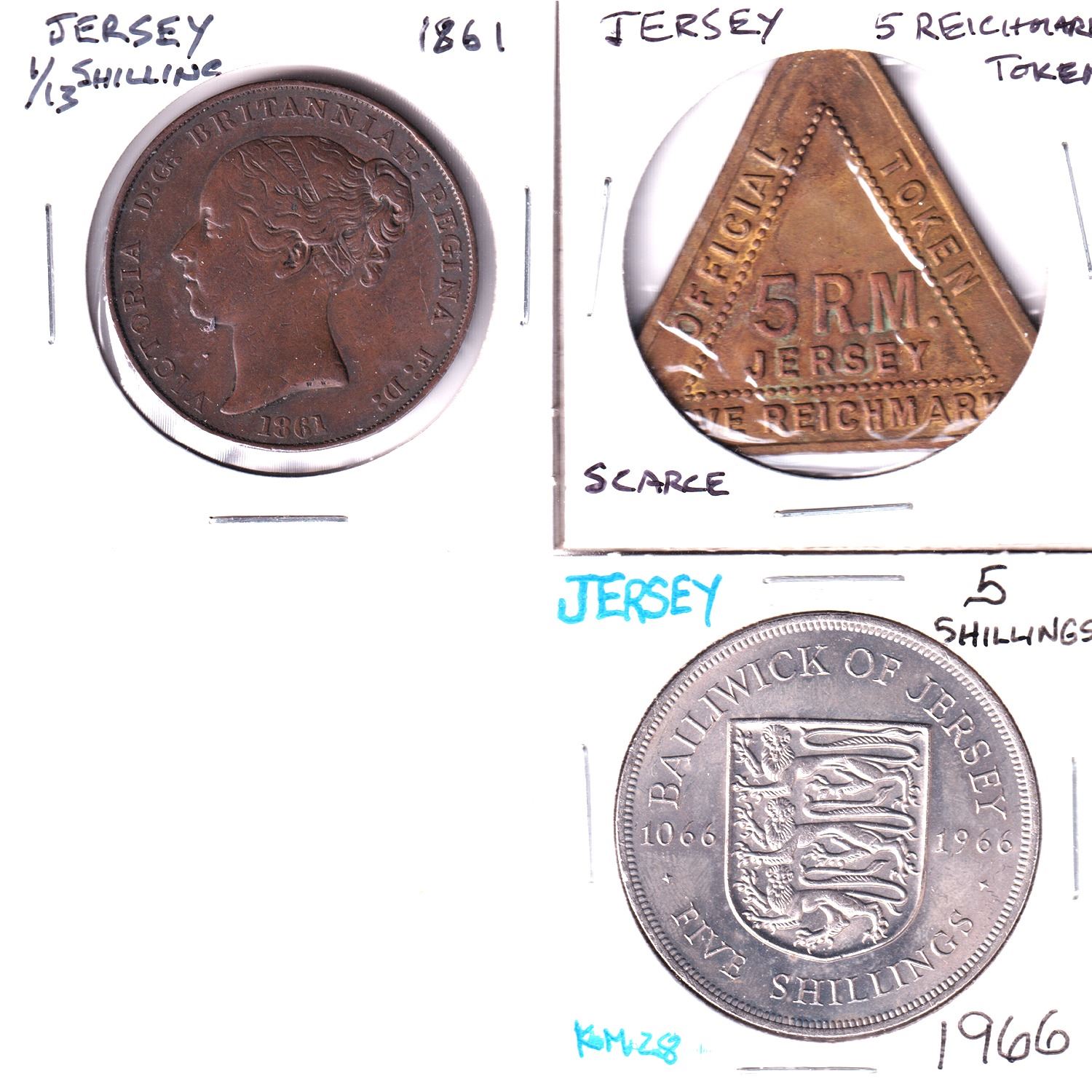 Estate Lot of Jersey 5 Reichmark Token, 1861 1/13 Shilling & 1966 5 Shilling. 3pcs