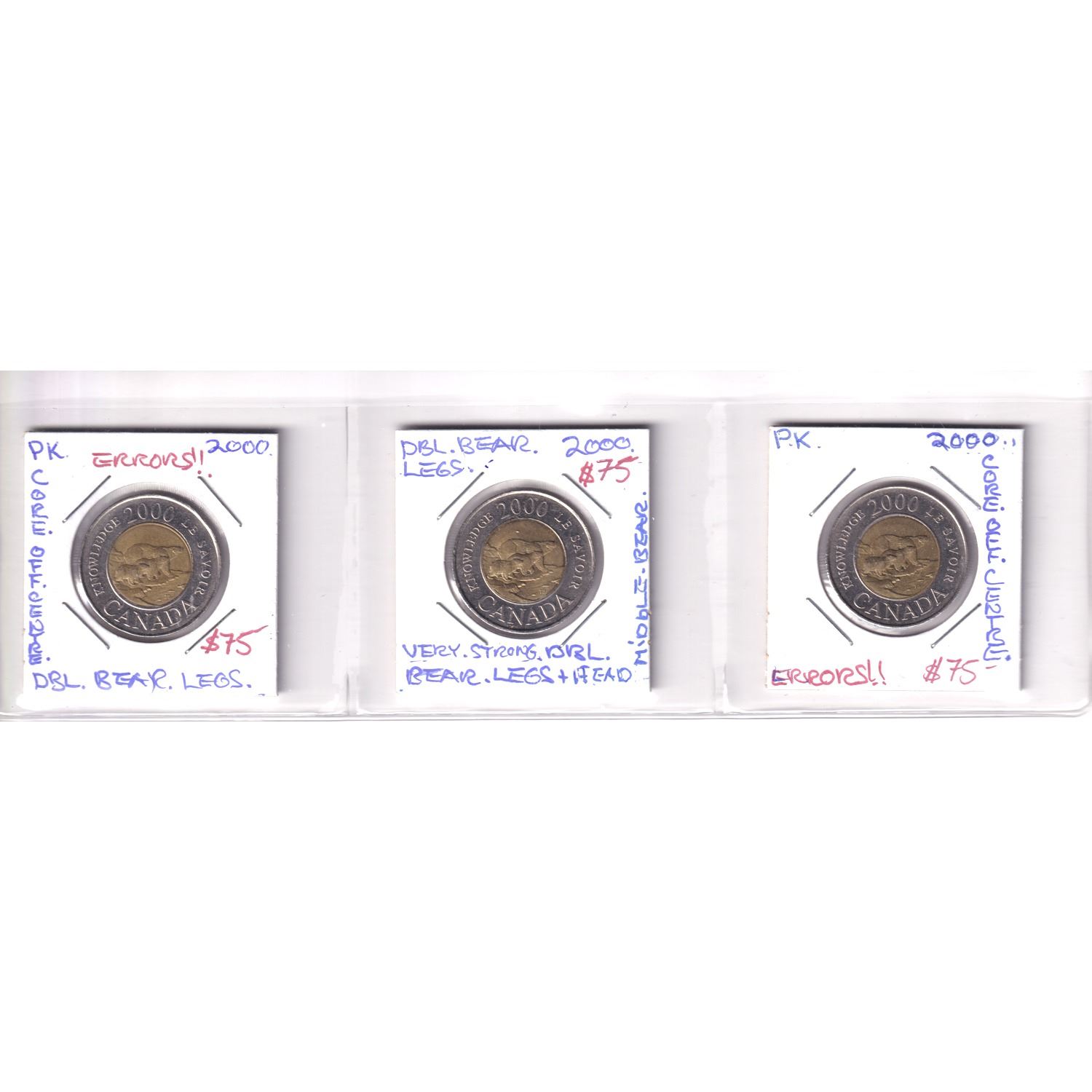 Estate Lot of Major Toonie 'Errors' Dated 2000 Knowledge Version. Featured errors include core off centre and doubling. All errors listed on holders. 3pcs