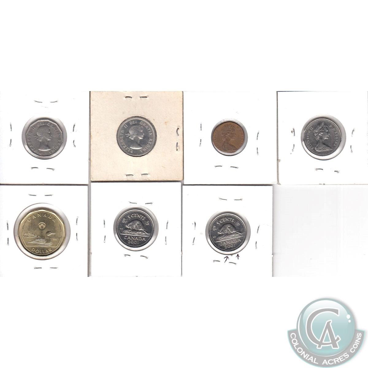Estate Lot of Mixed Canada Coins with Minor Errors. You will receive a 1955 5-cent with Doubling on '5', 1964 5-cent 'Die Crack', 1969 1-cent 'Stamp Wrong', 1979 5-cent Clipped, 2x 2001P 5-cent with minor errors, and 2016 Loon with Flawed Finish.