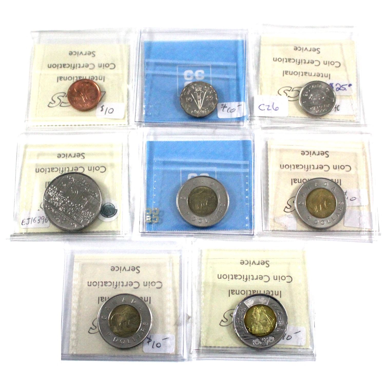 Estate Lot of Mixed Canadian ICCS Certified Coins - 2006 1-cent Logo Magnetic MS-64 Red, 1944 5-cent Missing Chrome AU-50 (Scratch), 2006 5-cent MS-65, 1982 Nickel $1 Constitution MS-65, 2003 $2 New Effigy AU-50, 2003 $2 MS-64, 2006 $2 MS-64, 2012 $2 HMS Shannon MS-64. 8pcs