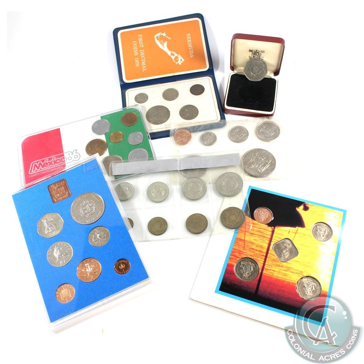 Estate Lot of Mixed World Coin Collection. You will receive the following; 1969 Jamaica 6-Coin Set (cellophane is damaged), 1973 50 Franc in clamshell case, 1970 Bermuda 5-Coin Set in Folder, 1972 Great Britain 7-Coin Set in display case, 1981 Yugoslavia 8-Coin Set in plastic holder, Mexico 7-Coin Set is plastic display, and Bahamas 5-coin Collection in display folder. 7pcs.