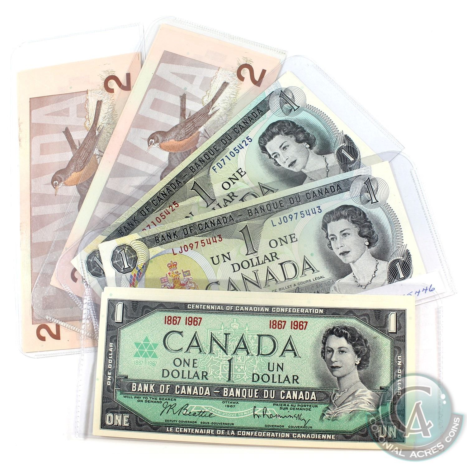 Estate Lot of Multiple Consecutive Serial Number Bank of Canada Notes. You will receive 5x 1867-1967 Centennial date notes (5x AU & 1x UNC), 4x 1973 $1 BC-46a (UNC), 5x 1973 $1 BC-46a (UNC), 3x 1986 $2 BC-55b-i (UNC) & 6x 1986 $2 BC-55c (UNC). 5 sets total.