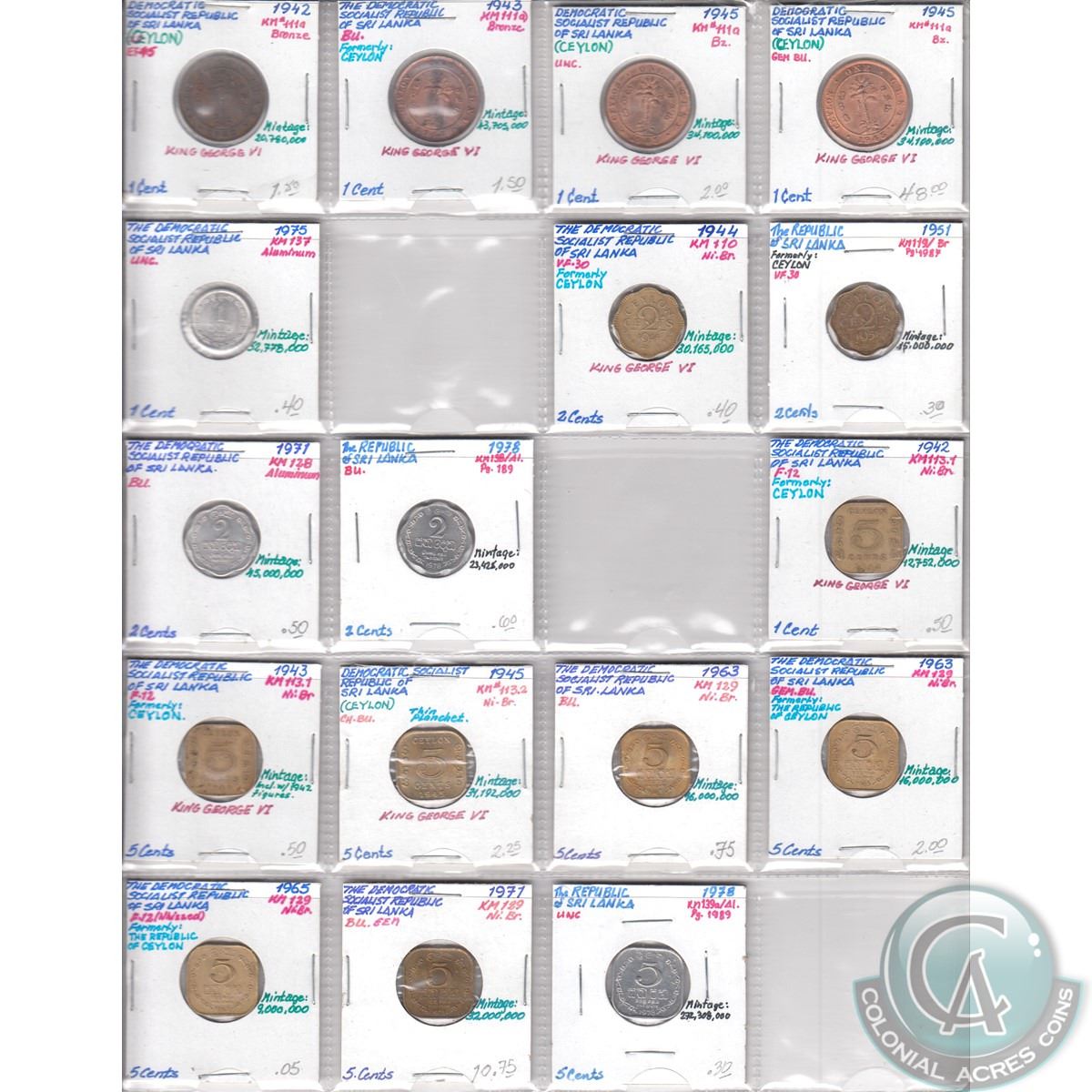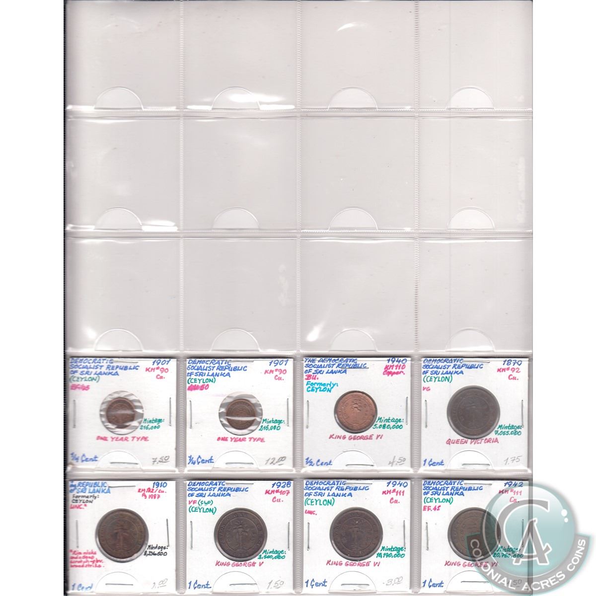 Estate Lot of Sri Lanka Mixed Coin Collection. Dates range from 1870 to 1989. Pages sold as is. Please view image (43pcs)