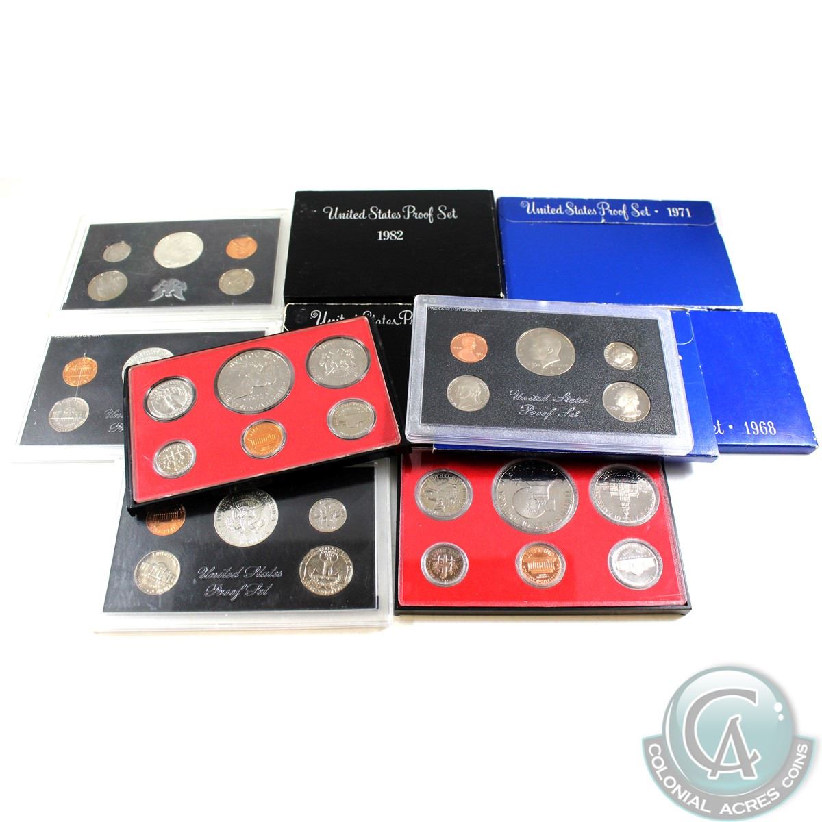 Estate Lot of United States Proof Sets. The dates you will receive are: 3x 1968, 1971, 1976, 1977, 1979, 1982 & 1983. Some coins are toned and sets are impaired. 10pcs