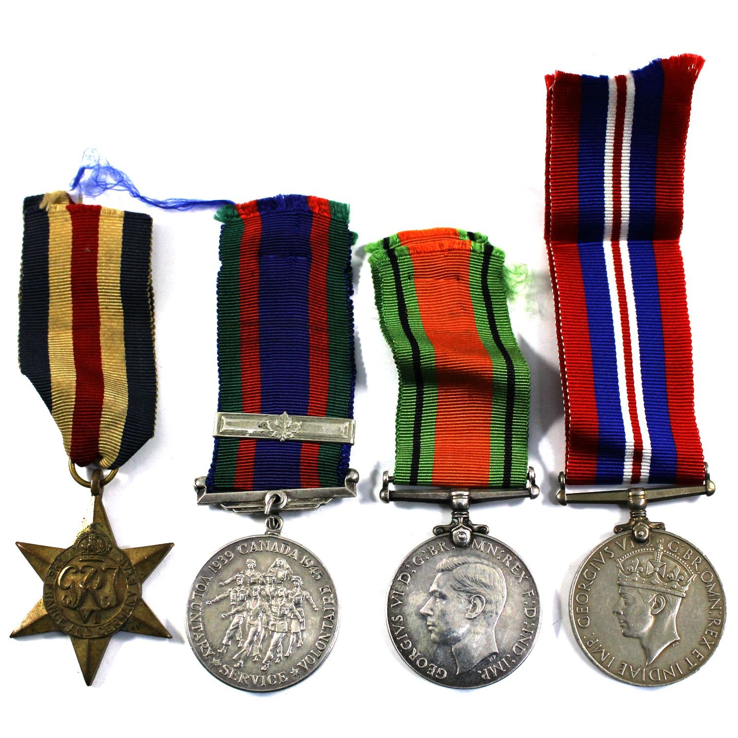 Estate Lot of War Medals with Ribbons. You will receive the Voluntary Service medal, Fance and Germany Star, 1939-1945 Defence Medal and the 1939-1945 War medal. 4pcs