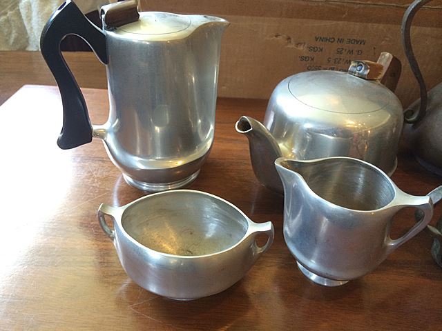 Nice collection of antique copper parrot pots from India (estate estimates that they are over 200 years old), copper lidded can marked A.A. Adrain. Emaus. Pa. 1912, vintage metal can "made in England for Restoration Hardware", vintage metal basket, and tea set of English Picquot Ware.