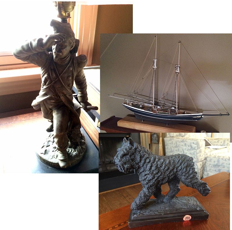 Estate Lot includes Bronze Bouvier Dog Statue on marble base by Christine Baldwin. Dated 1989 and numbered 1 of 50. Measures approx. 8" high x 7" wide x 3 1/2" deep. Vintage Lamp of Revolutionary war soldier, WWI era, French or Belgium and Model Ship. These items come from a Litchfield, CT estate.