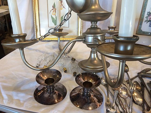 Beautiful lot of estate items including pewter tone ceiling light, silverplate pitcher, candle sticks, buttern dish, flatware, etc., vintage desk clock, German steins, large Blue Willow platter, decorative artwork, and pair of Hummel salt and pepper shakers, Friers. Beautiful lot in time for the Holidays!