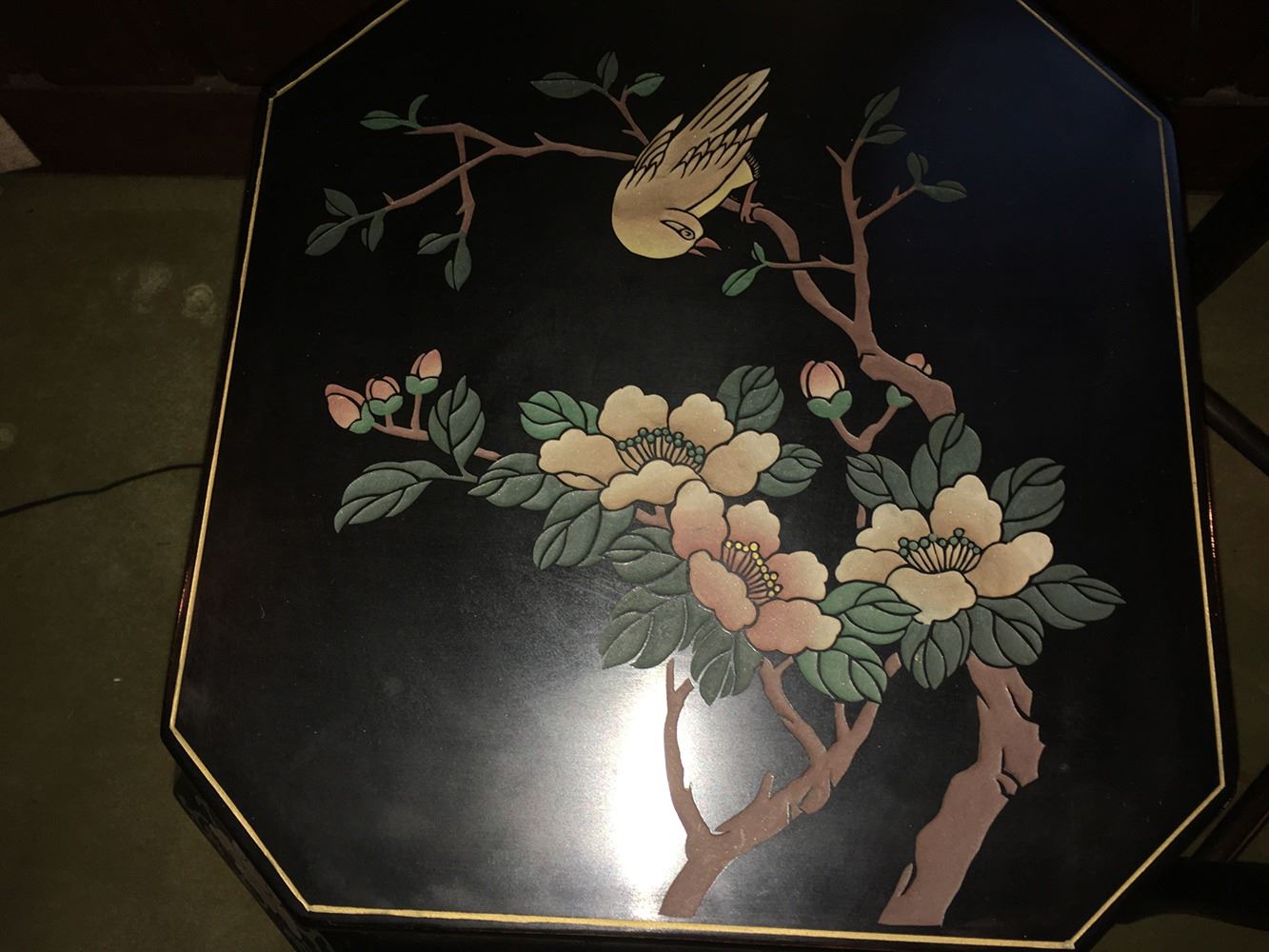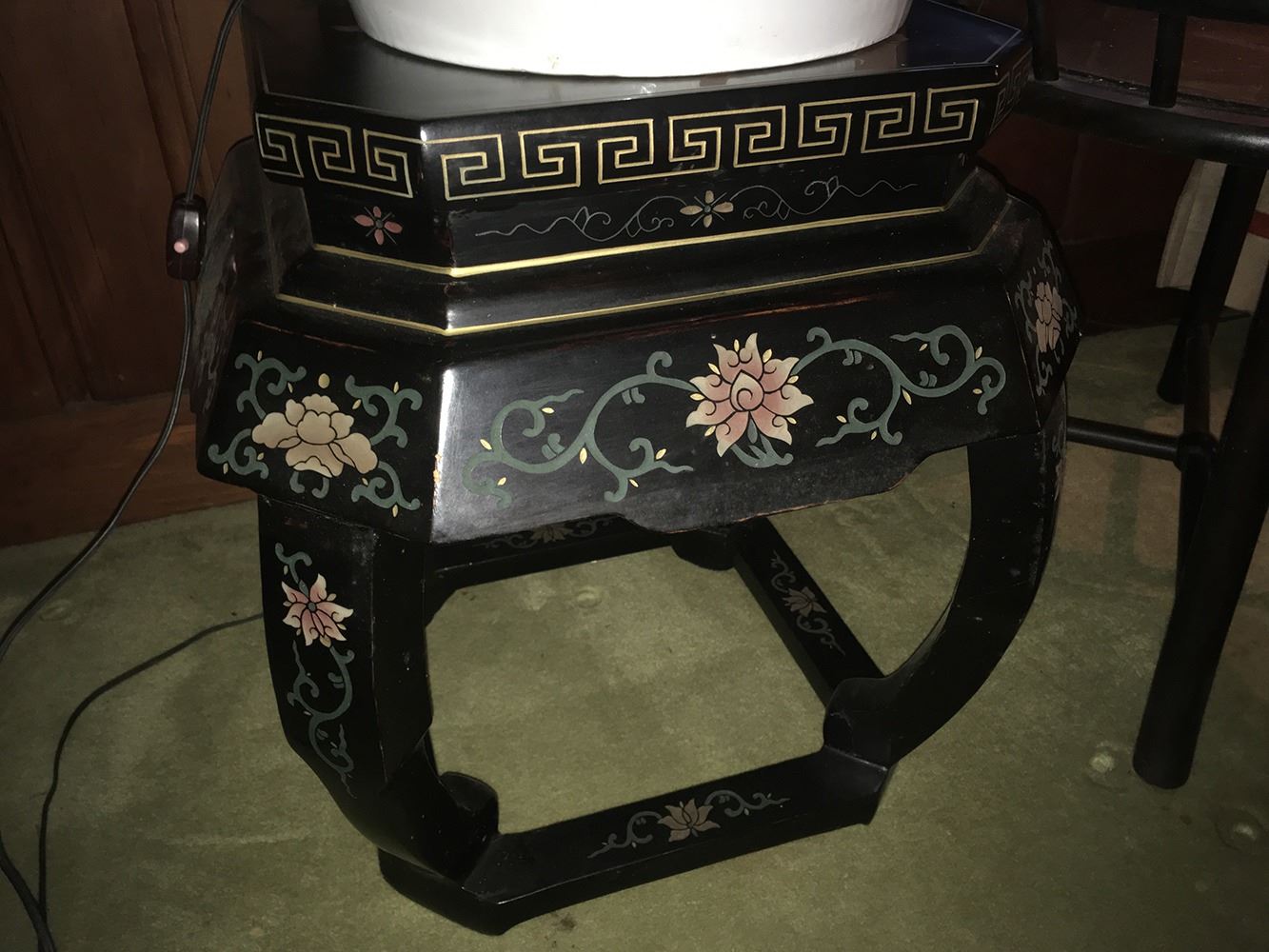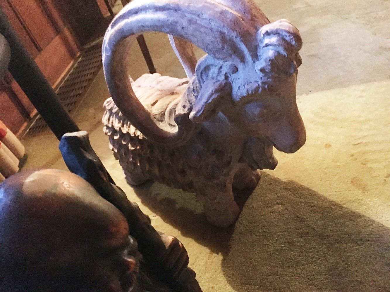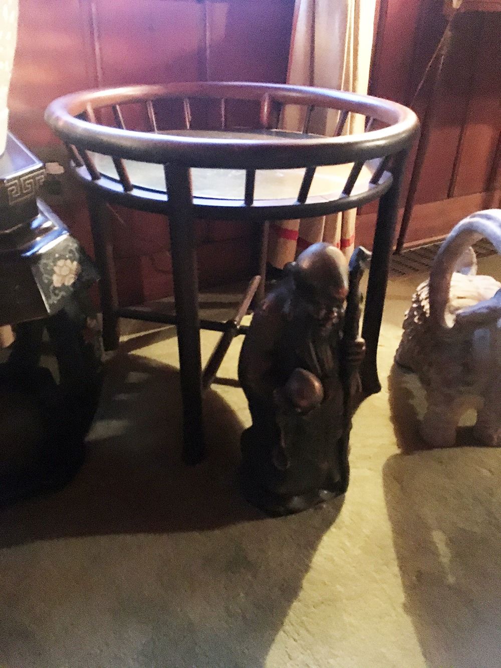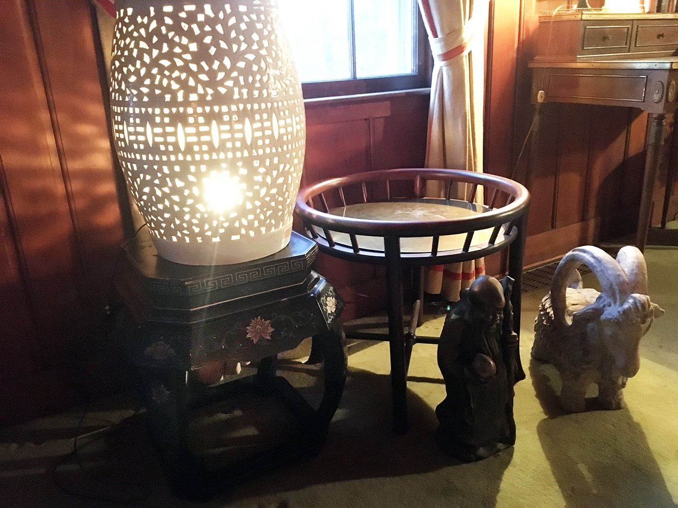 Estate lot includes Buddha statue, ram statue, lacquered table, Asian side table with brass, and ceramic lamp. pd