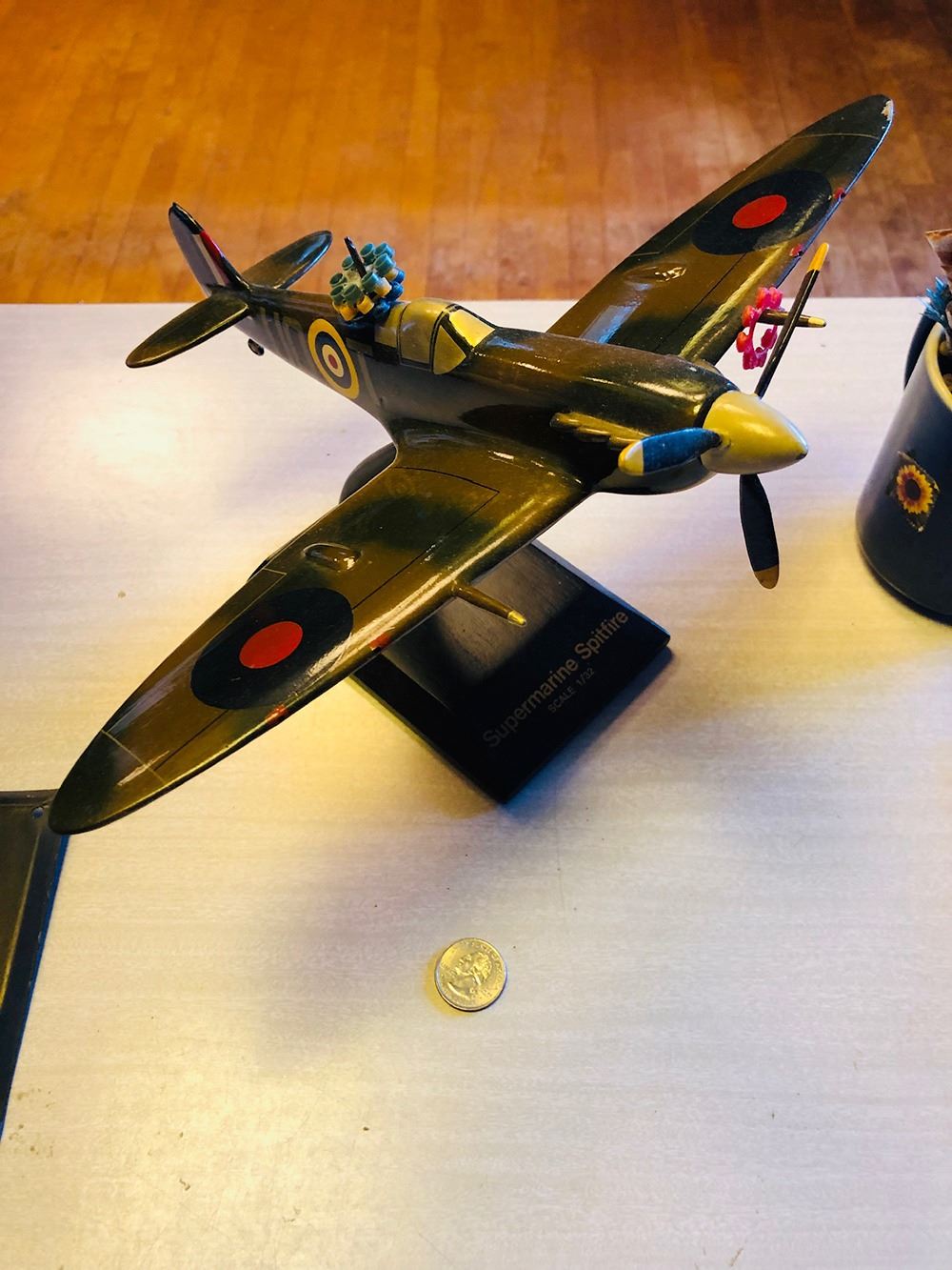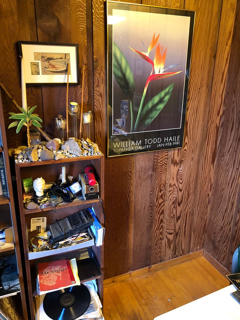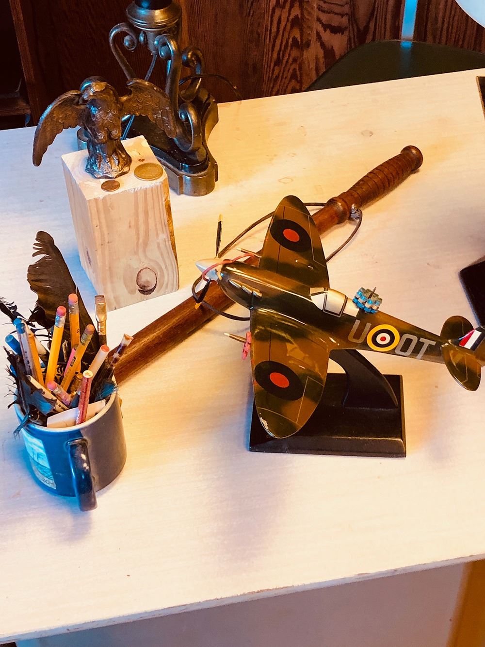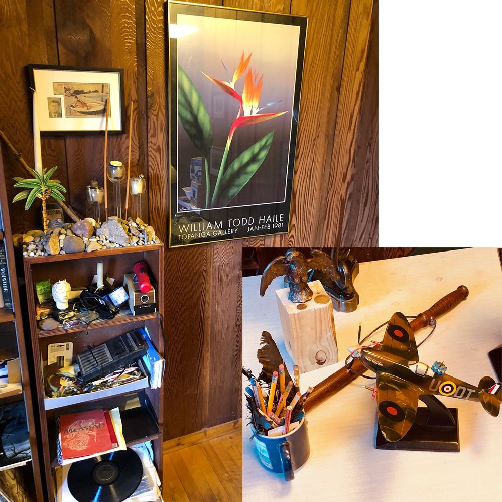 Estate lot including small book shelf and contents, candle holders, desk contents including airplane model, framed print. pd estate