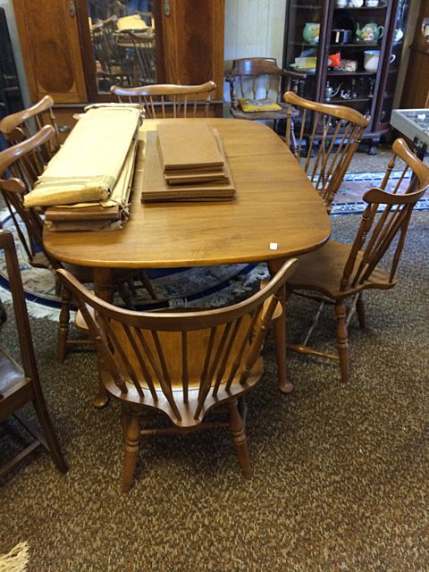 Circa 1950's - 1960's solid maple dining room set with 6 brace back windsor back chairs; 2 arm and 4 side. Table top measures 61" x 39" wide, has 4 leaves with pads, Queen Anne legs. Matching 2 piece hutch. Top section has plate rales, scallop top, 2 wire decorative doors with drawers and doors at base. Also has center drawer for silverware. Hutch measures approx. 55" wide x 20" deep x 70" tall. These items must be picked up in Torrington, CT. Appointment time will be scheduled after auction date. (contents of hutch are NOT included.)