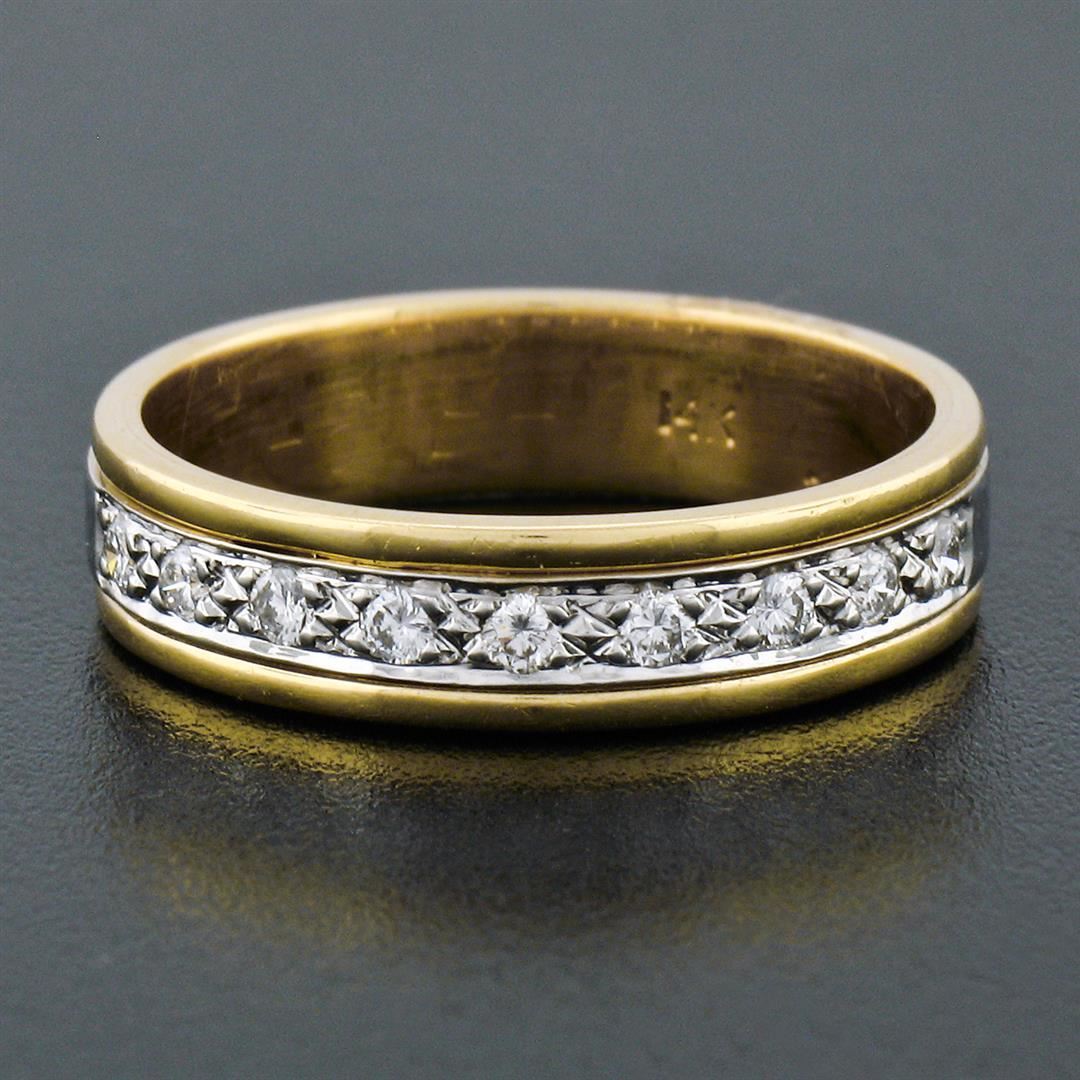 A solid 14k yellow & white gold men's band ring, with 9 round brilliant cut natural diamonds (G/H - VS2/SI1; 0.25ctw). The ring is size 7.0, weighs a total of 4.22 grams, and measures 4.80mm wide.