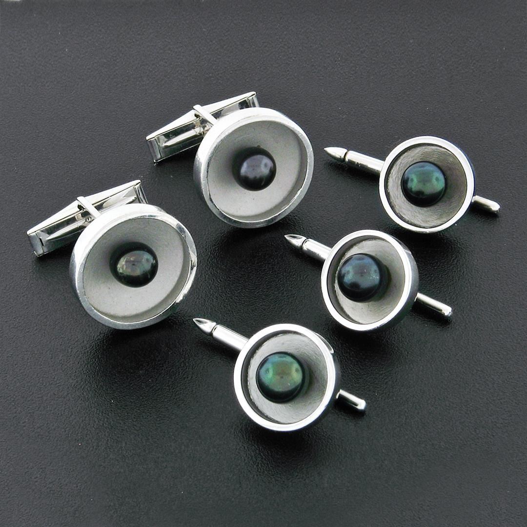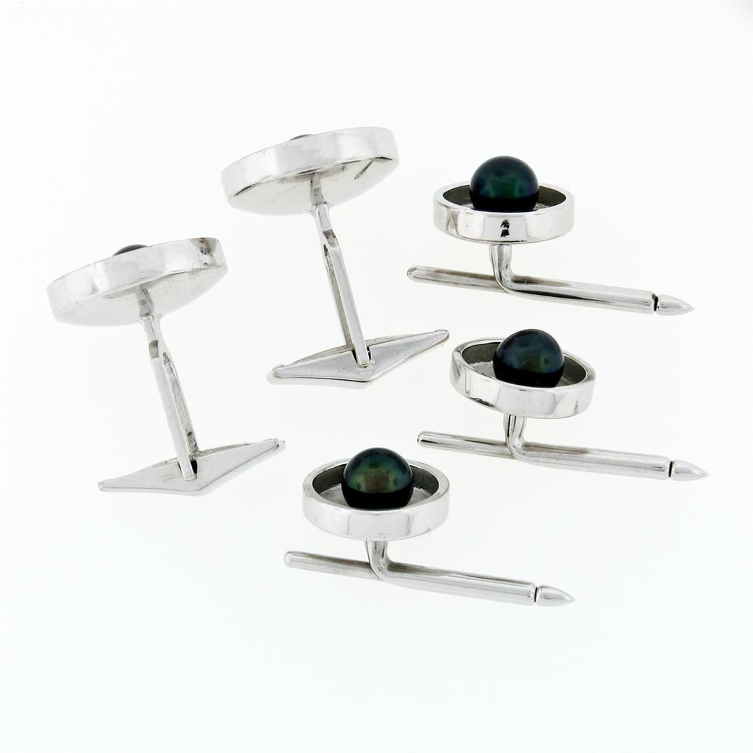 An estate solid 14k white gold round cufflink & 3 button stud set, with 5 round bead shape black natural pearls (6.2-6.7mm ). These cuff links have a swivel design with a clearance of 13mm, weigh a total of 26.44 grams, and the front panels measure 17mm in diameter, and the button studs measure in diameter 13.5mm.