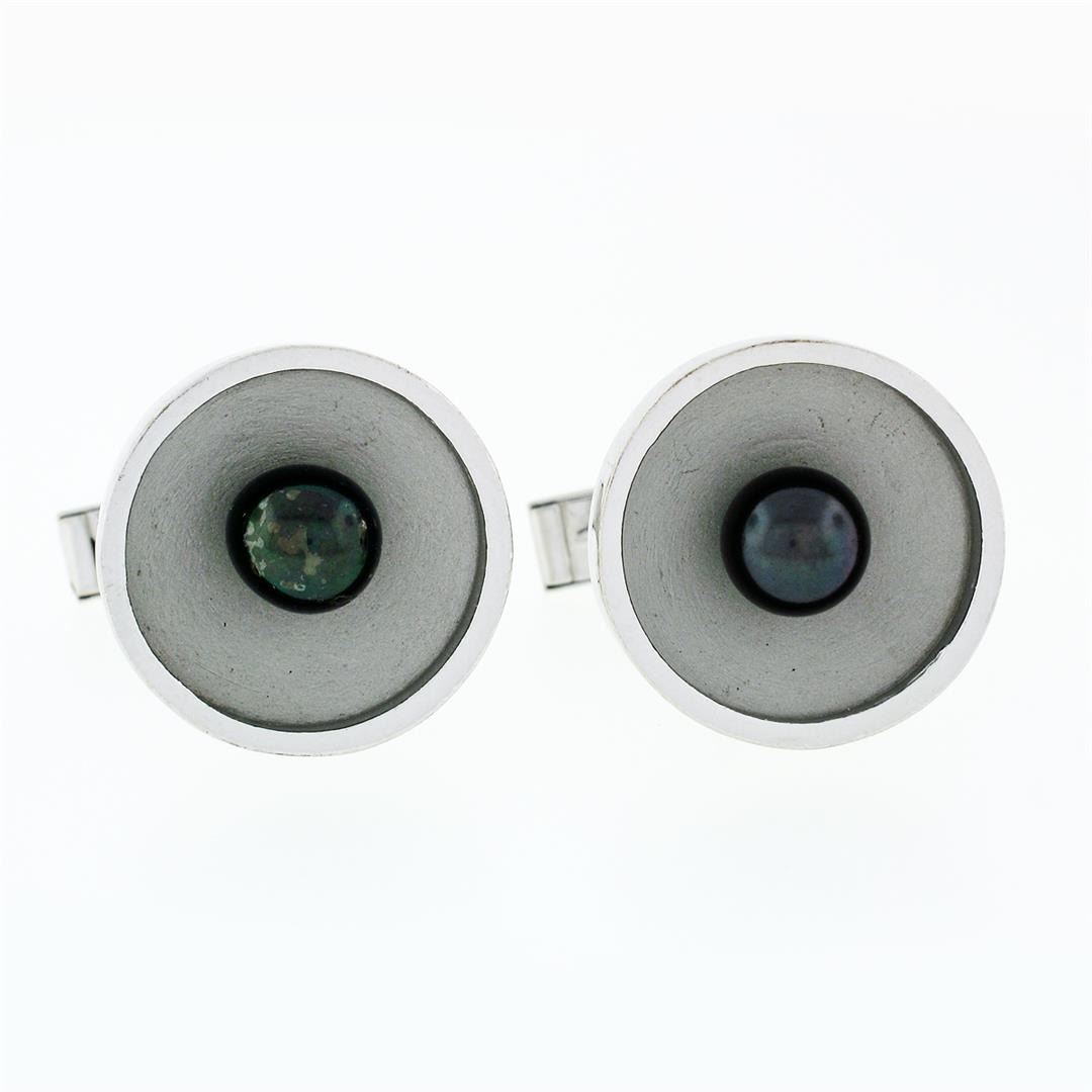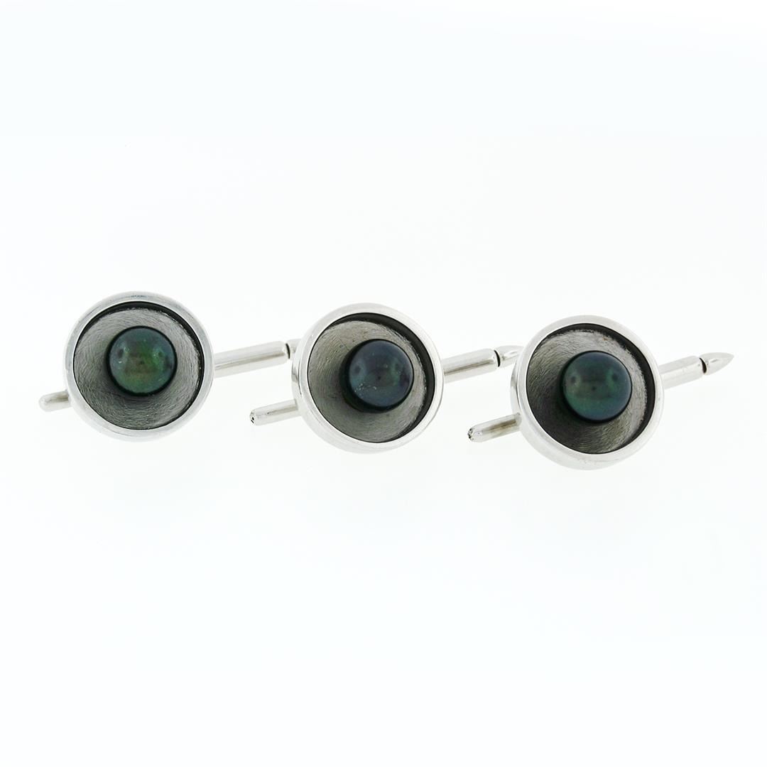 An estate solid 14k white gold round cufflink & 3 button stud set, with 5 round bead shape black natural pearls (6.2-6.7mm ). These cuff links have a swivel design with a clearance of 13mm, weigh a total of 26.44 grams, and the front panels measure 17mm in diameter, and the button studs measure in diameter 13.5mm.