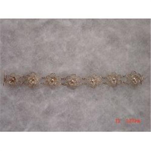 Here is a lovely probably middleeastern sterling filigree floral bracelet. It has individual links that are held firmly intact by several prongs. This is in good condition, I do not see any signatures or markings. 7 1/3 inches wide