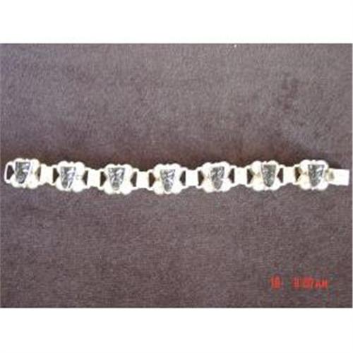 Here is a signed STERLING MEXICO Obsidian stone link bracelet. There are 7 individual links each sterling link is engraved and has a black obsidian face Aztec Mayan type figure on the front. This bracelet is probably 1930-1940s. It is in excellent condition, with only 1 of the individual faces having a very small portion of stone chipped away. This is not noticeably unless you use a magnifying glass. Very nice hand made strong link sterling bracelet