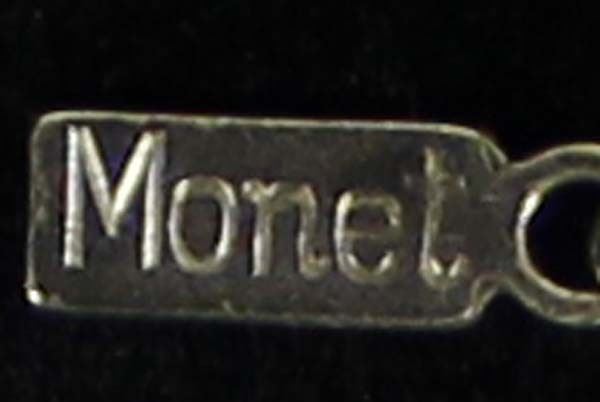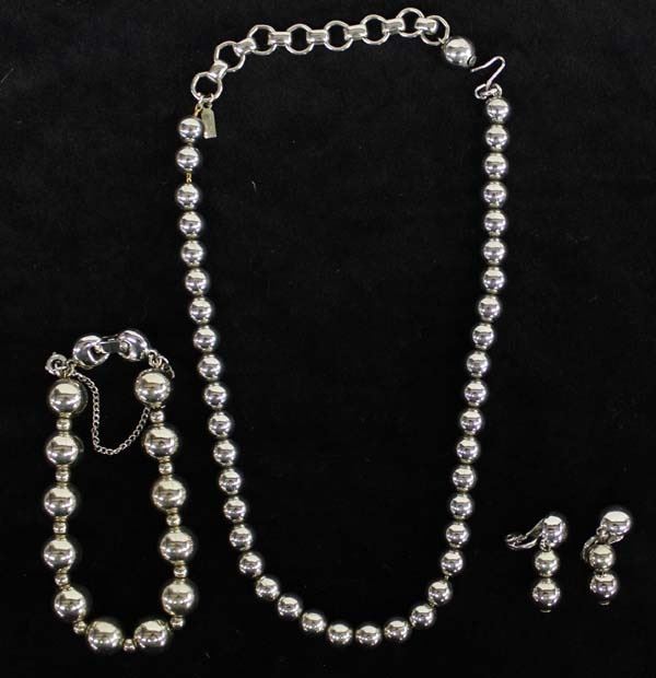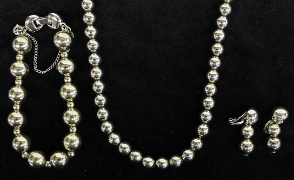 Estate Monet Silvertone Beaded Necklace, Earrings, and Bracelet hallmarked, necklace measures 17''L end to end and is adjustable in length, bracelet measures 10''L end to end (includes safetly chain), leverback earrings measure 1.25''L, largest bead measures 3/8''D
