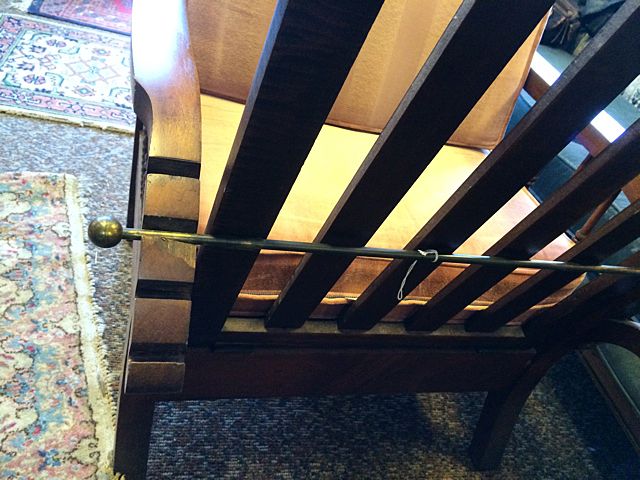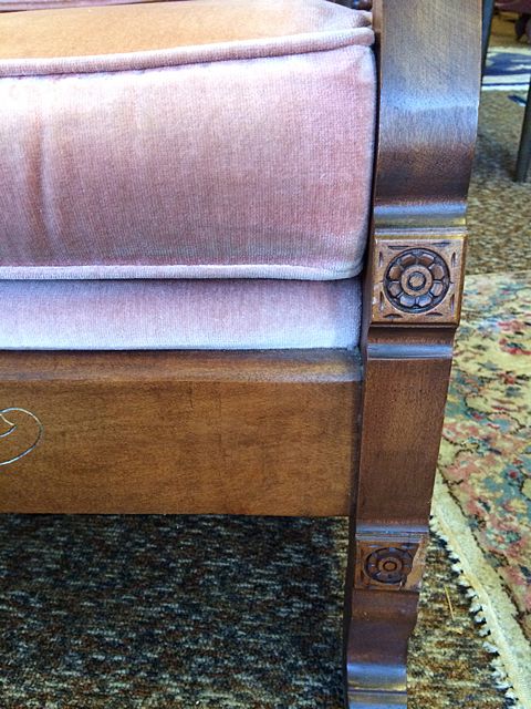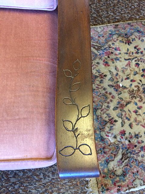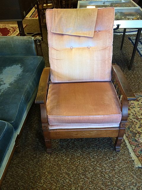 Well over 100 years old. Morris chair with adjustable back, nice tufted upholstered back, has the original bar for adjusting back. Appears to be mahogany or cherry. Has vine carvings with leaves on each arm. Very unusual style. This item may be picked up in Torrington, CT. Appointment time will be scheduled after auction date.