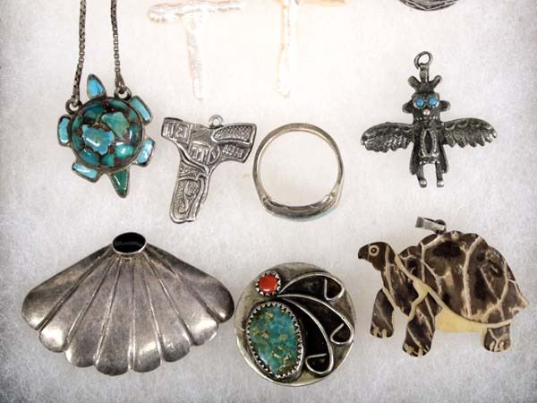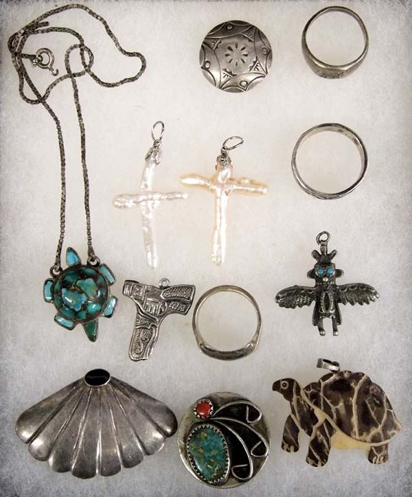 Estate Native American Jewelry Plus, includes Route 66 Thunderbird, pair of pearl crosses, antique Navajo Bolo slide, vintage turtle pendant, 3 rings sizes 7-7.5-9, antique sterling silver Navajo button, plus other treasures, longest measures 1.75'' x 1.25