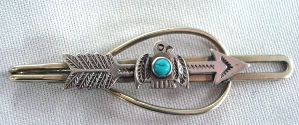 Estate Navajo Sterling Turquoise Tie Clasp. Arrowhead design with small thunderbird. 2.5''L x .75''H.
