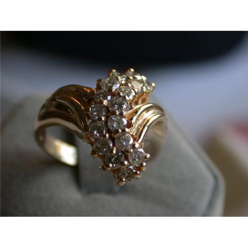 1 Ct* Diamond Cluster ring in heavy 10K YG Mounting. There are 16 Diamonds (Very White and Clean) at .06 each for the total weight of 1 Ct. Just over 1/2" from point to point. Very Pretty Swirl Design in the gold. Size 7 1/2 but could be sized by any professional jeweler. *all stone size is approximate unless an appraisal comes with the item.