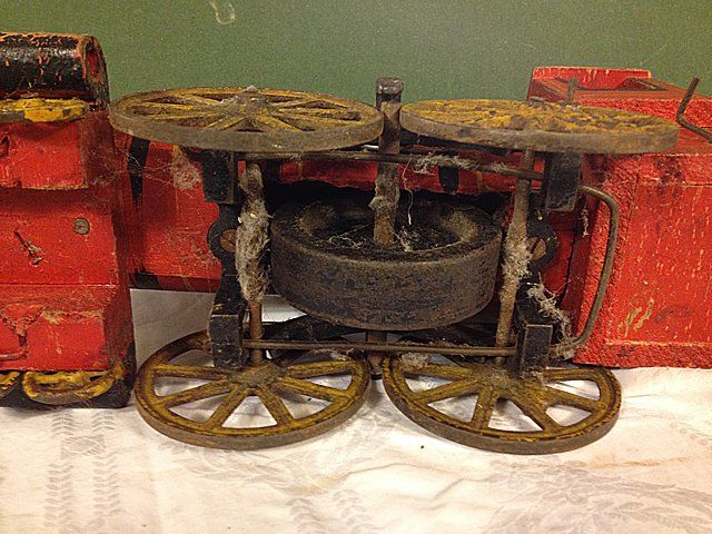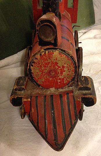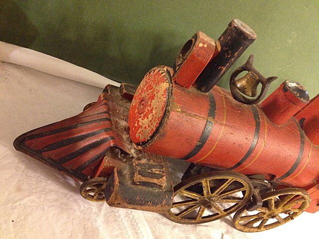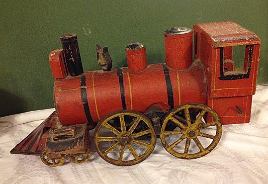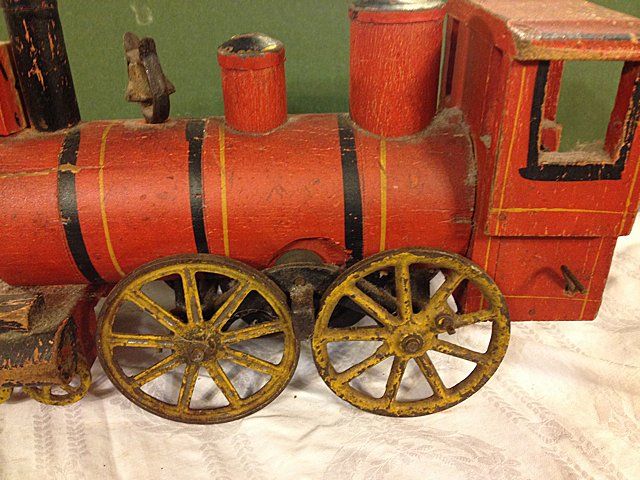 Estate Outstanding folk art toy in the shape of train engine. Cast iron and wood, has early mechanism underneath traction movement. Stencilling and paint in beautiful condition. Still works (family was told this train was worth approx. $800). Train measures 12" long x 6" high x 4" deep.