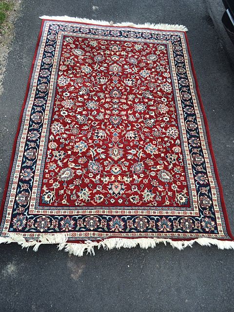 Beautiful Persian Style Hand Woven Rug with deep rich reds and blue colors. From the estate of a Doctor's home, kept in very nice condition, originally paid well over what is estimated for this rug.