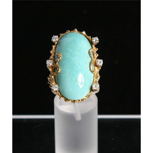 Many of you know me from my five years of national jewelry television shows, Estate Jewelry with Sam and Lisa and Jewelry and Collectables with Lisa. Now I am honored to present these beautiful antique and estate finds to you through Go Antiques. Here is a georgeous one-of-a-kind designer Persian turquoise, diamond and gold ring.  The oval Persian turquoise is approx 20ctw and surrrounded by 6 accent diamonds.  The 18K yellow gold custom mesh setting is stunning.  This ring is currently a size 9 and weighs 25.1 grams.  If you bid on this piece and do not win it, please visit my online store by clicking ?view this dealers other items? to see if it is still available for direct sale or offers. Need Ring Sizing?  Ask me about wholesale sizing prices. Personal shopping requests can be sent to ?email dealer?. Help make adoption a reality! Add a $4.00 ?Orphans R Gems? ?Support Adoption? blue silicone bracelet to your order or visit my non-profit Orphans R Gems website.