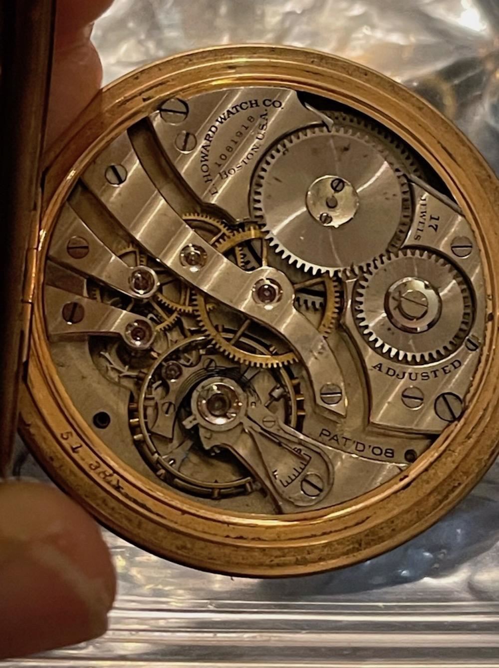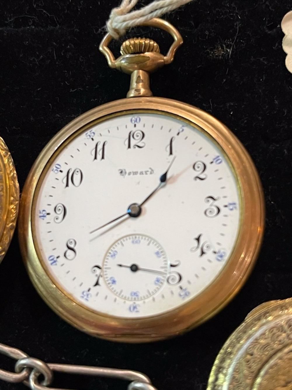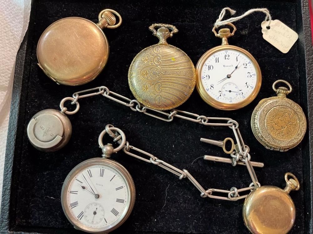 Estate pocket watch collection including Howard, Boston, MA., silver watch with silver watch chain and pill box, looks to be ladies watch, Waltham, etc.