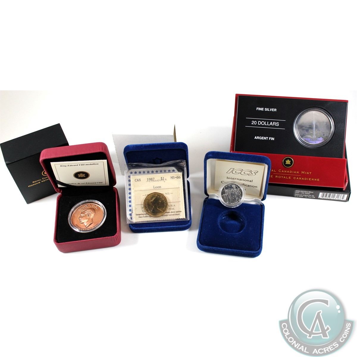 Estate RCM Collection. You will receive 1987 Loon ICCS Certified MS-66, King Edward VIII Medallion (impaired capsule), 2005 Netherlands Liberation 25-cent, and 2006 $20 CN Tower Fine Silver Coin. 4pcs.