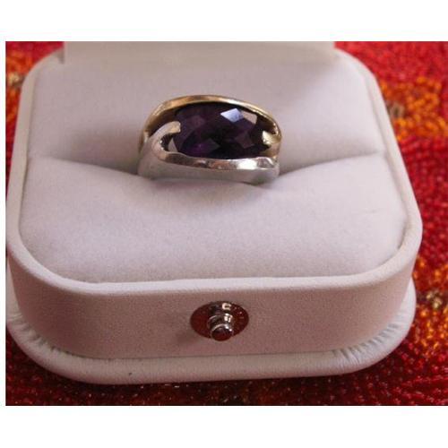 One of a kind custom designed estate Ring featuring a dramatic contemporary setting with tons of drama. One side is 14kt gold, the other side is 14kt yellow gold married together with a large center rectangular shaped Amethyst, Appx. 12 carats. Weight: 11.4 grams. Ring Size: 6-1/4. Circa unknown but believed to be in the 80's. <p>Measurement: Width across top of ring: almost 1". Width: 1/4 across setting. Thickness at top side of ring: 1/2" - The ring is bold and definitely a signature piece. Hallmarked 14kt gold and initial. Design is in the style of Yurman
