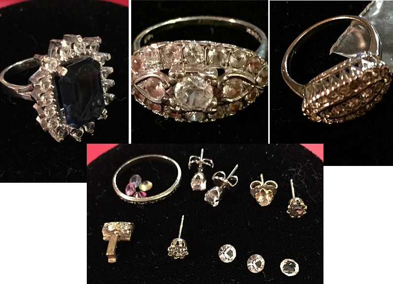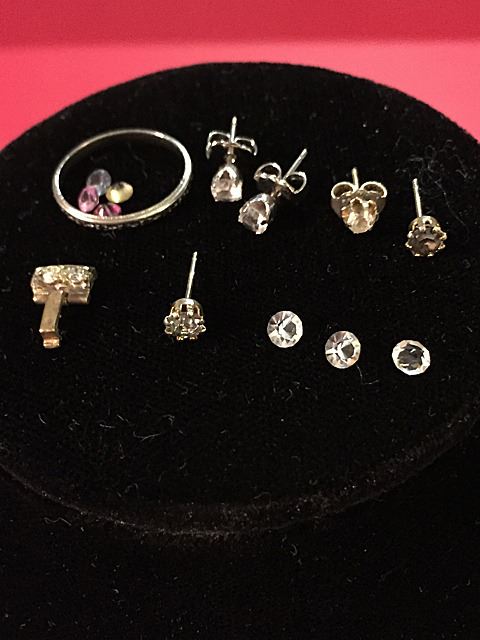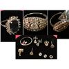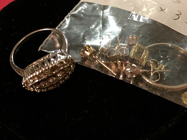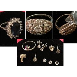 Silver marked 830 ring with blue stone and stones that resemble diamonds, ring with stones that resemble diamonds is set in 14kt gold, 18kt gold band, earrings, maybe some diamonds, this lot came in late, not enough time to check it, additional ring that looks similar to 14kt once, but we can't determine the marking on it. Nice lot of estate jewelry!