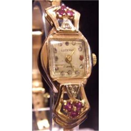 This 1920's Lucerne solid rose gold watch has six rubies and fifteen diamonds. It is all original and in working condition. The custom made band is original and of the period. It is 14kt solid rose gold with a buckle closure and adjustable notches. It has a safety chain which has been added to it.