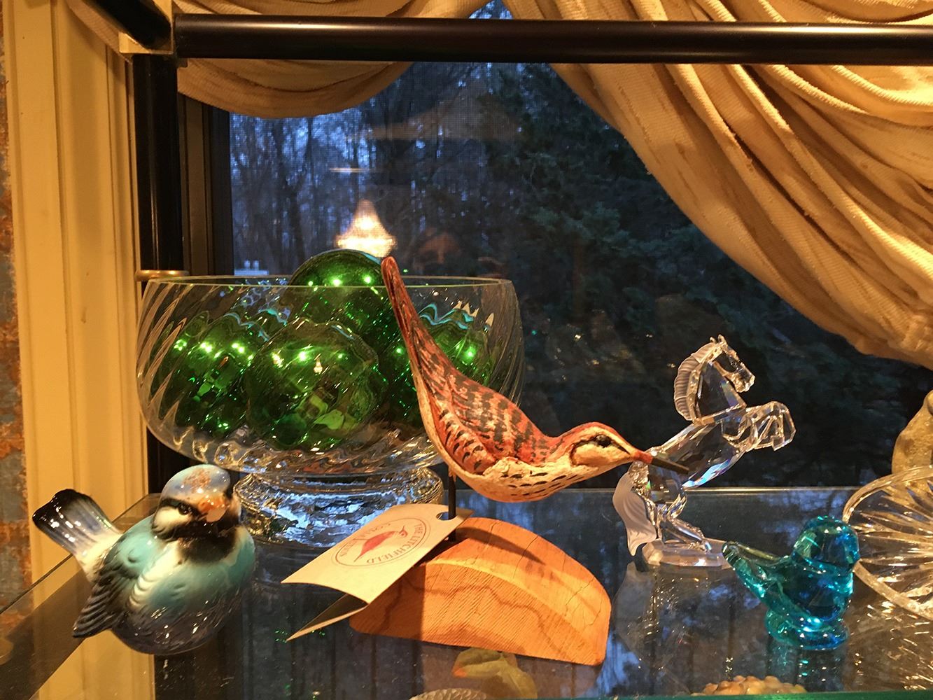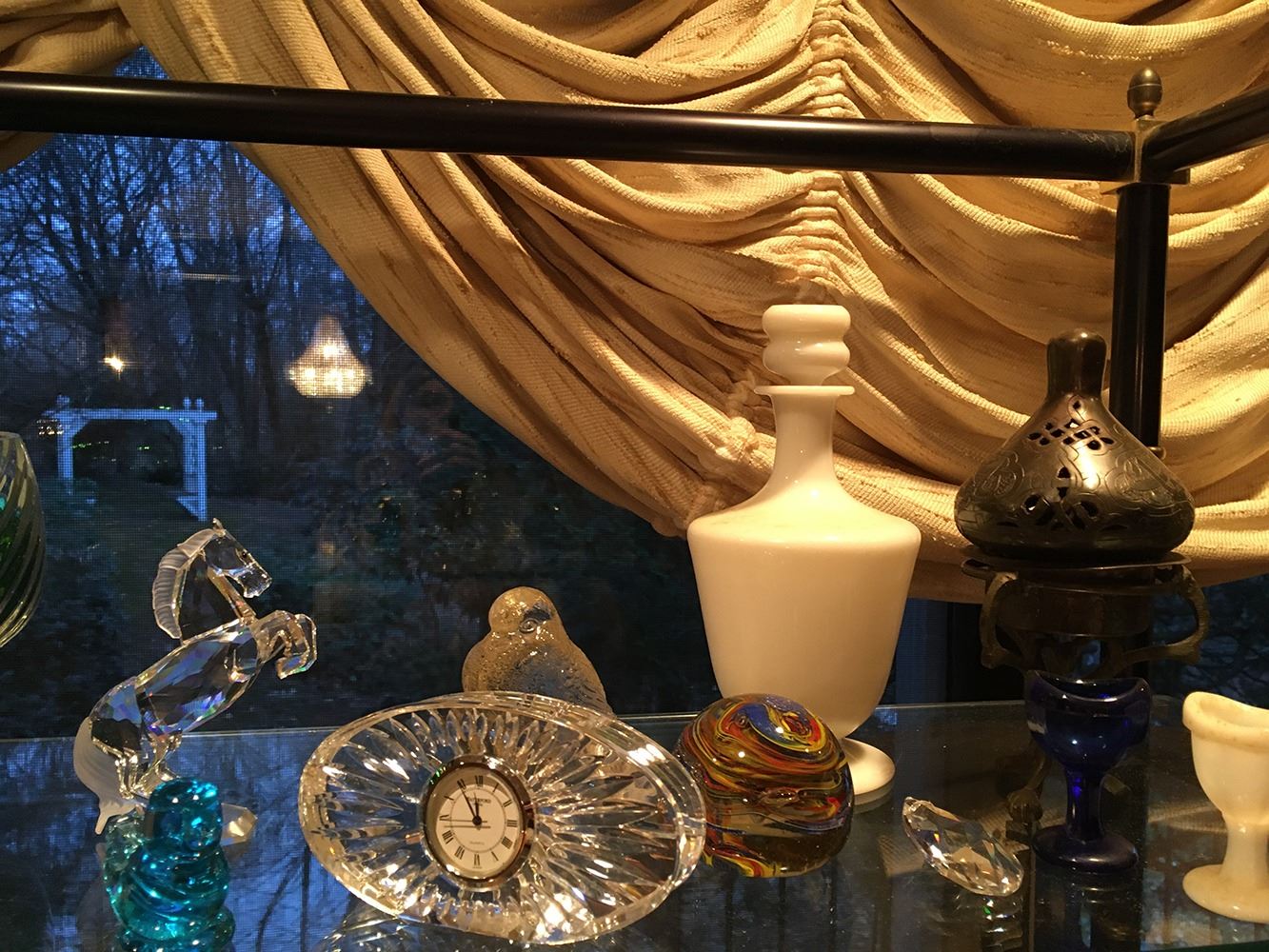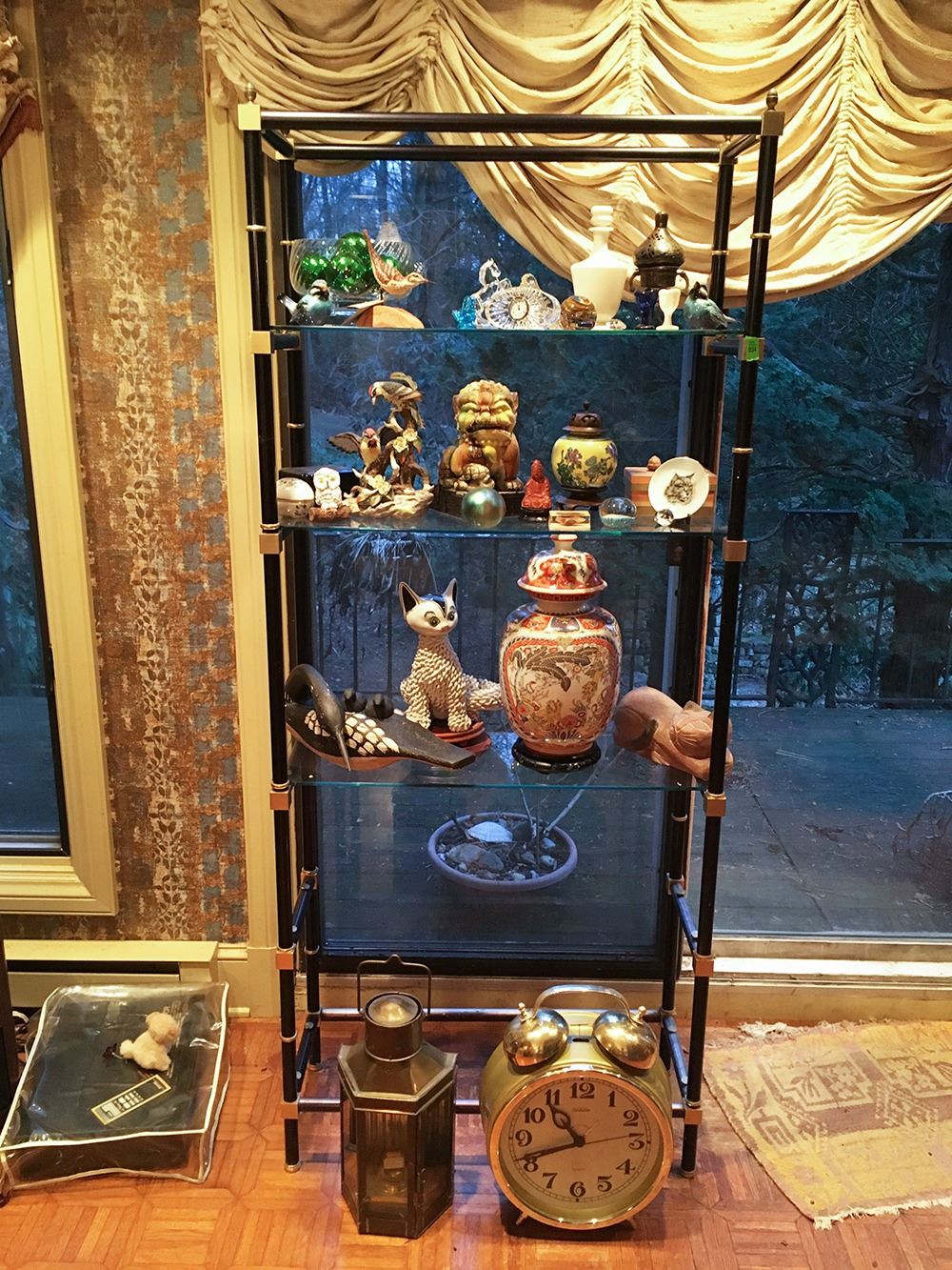 Shelf with Contents, 3 glass shelves, cat made in Italy, Morgan hand wood carved birds, paper weights, oriental items, Waterford crystal clock, caraved cat, crystal horse and birds, incense burner, brass oil lantern, (like a ships lantern), foo dog, floor alarm clock, etc. Shelf and all contents included. pd