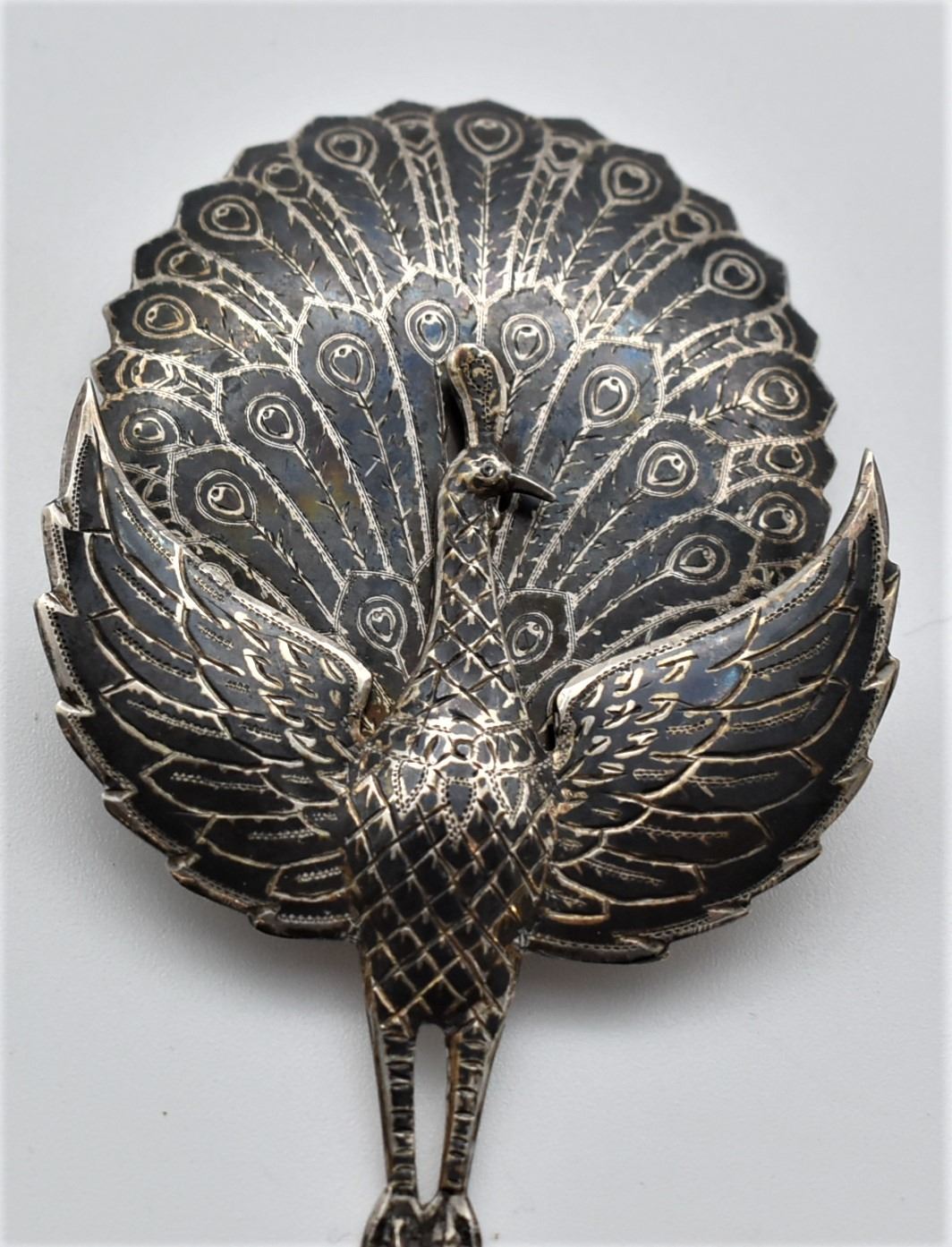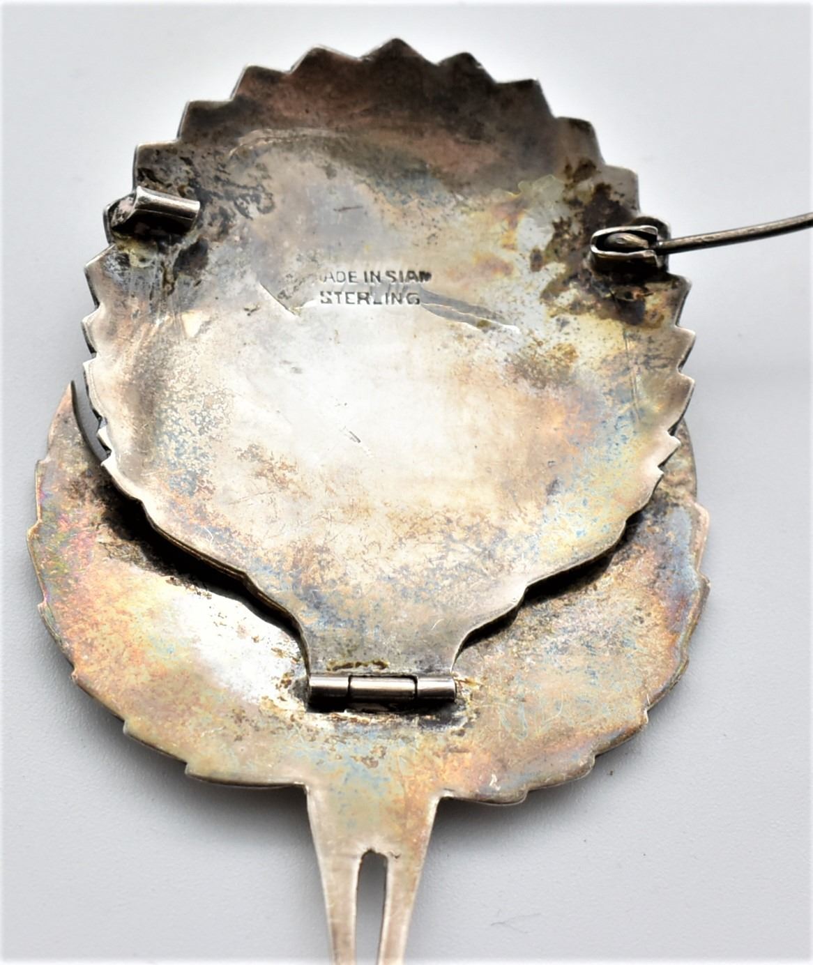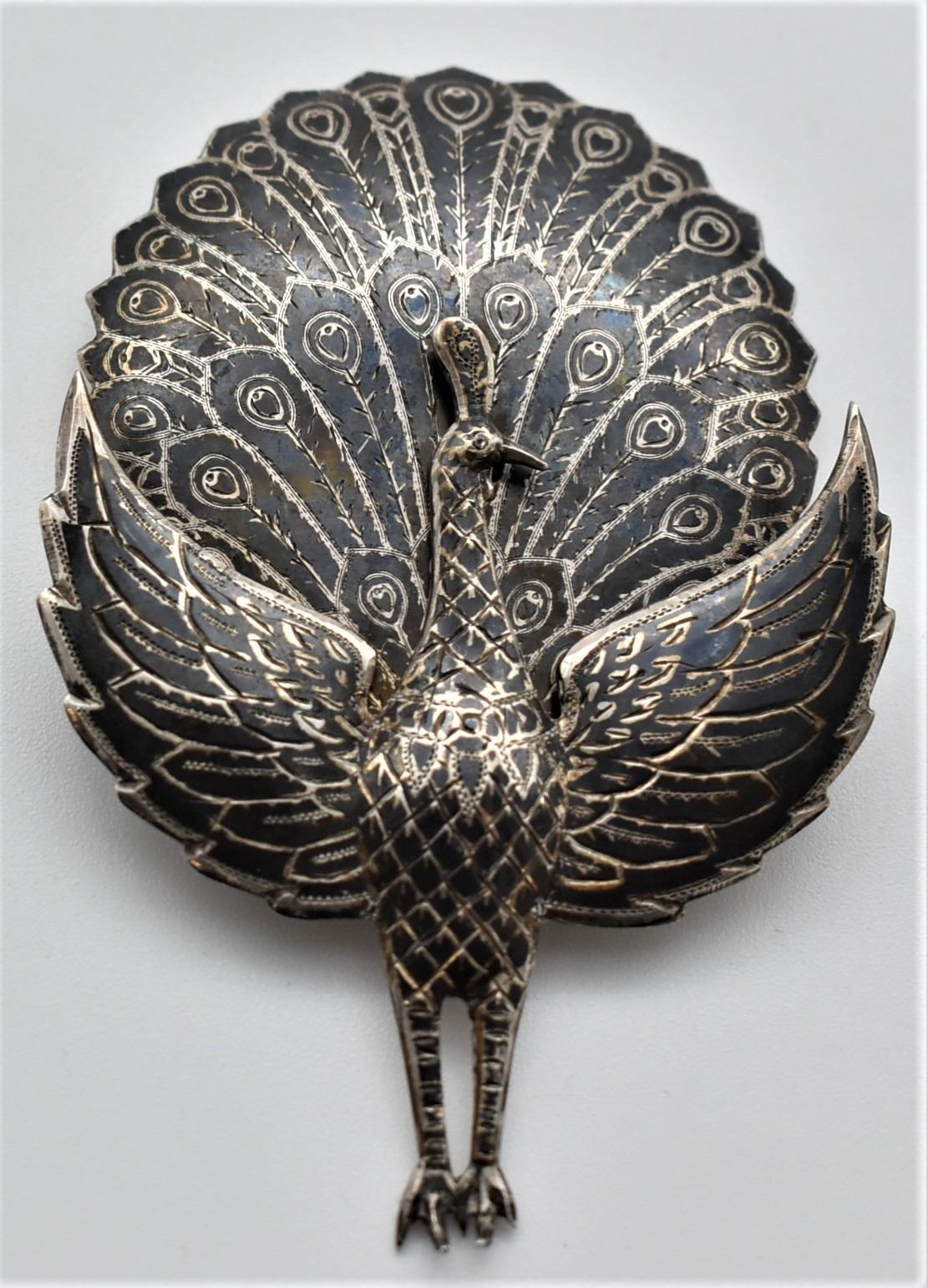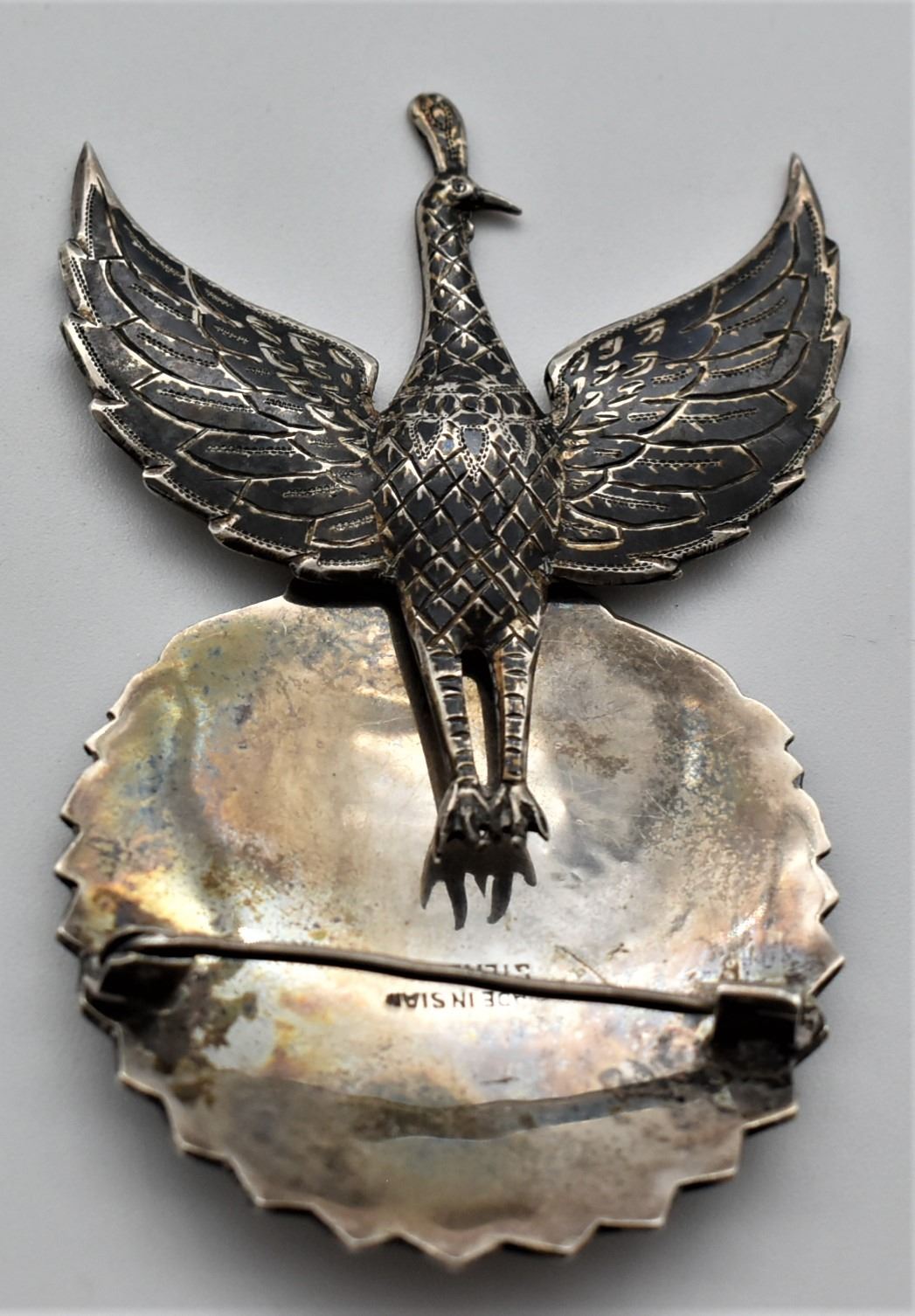 Vintage Estate Siam Sterling Peacock Pin, stamped ''Made in Siam Sterling'', peacock is articulated, total gram wt. of 25.76, truly a beautiful piece