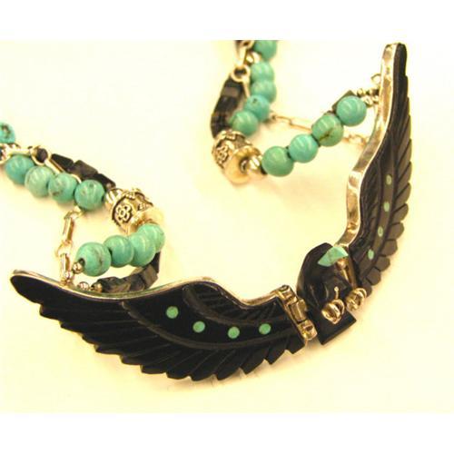 This is an exquisite signed Piece, circa 1920-1950. The carved detail of the eagle's wings and features are beautiful. The beak is turquoise and the wings are set with hinges so they move. The back of the piece is flat sterling silver marked and signed. The necklace is approximately 18 inches long beaded in onyx and turquoise. Please feel free to contact me if you have any questions. thank you