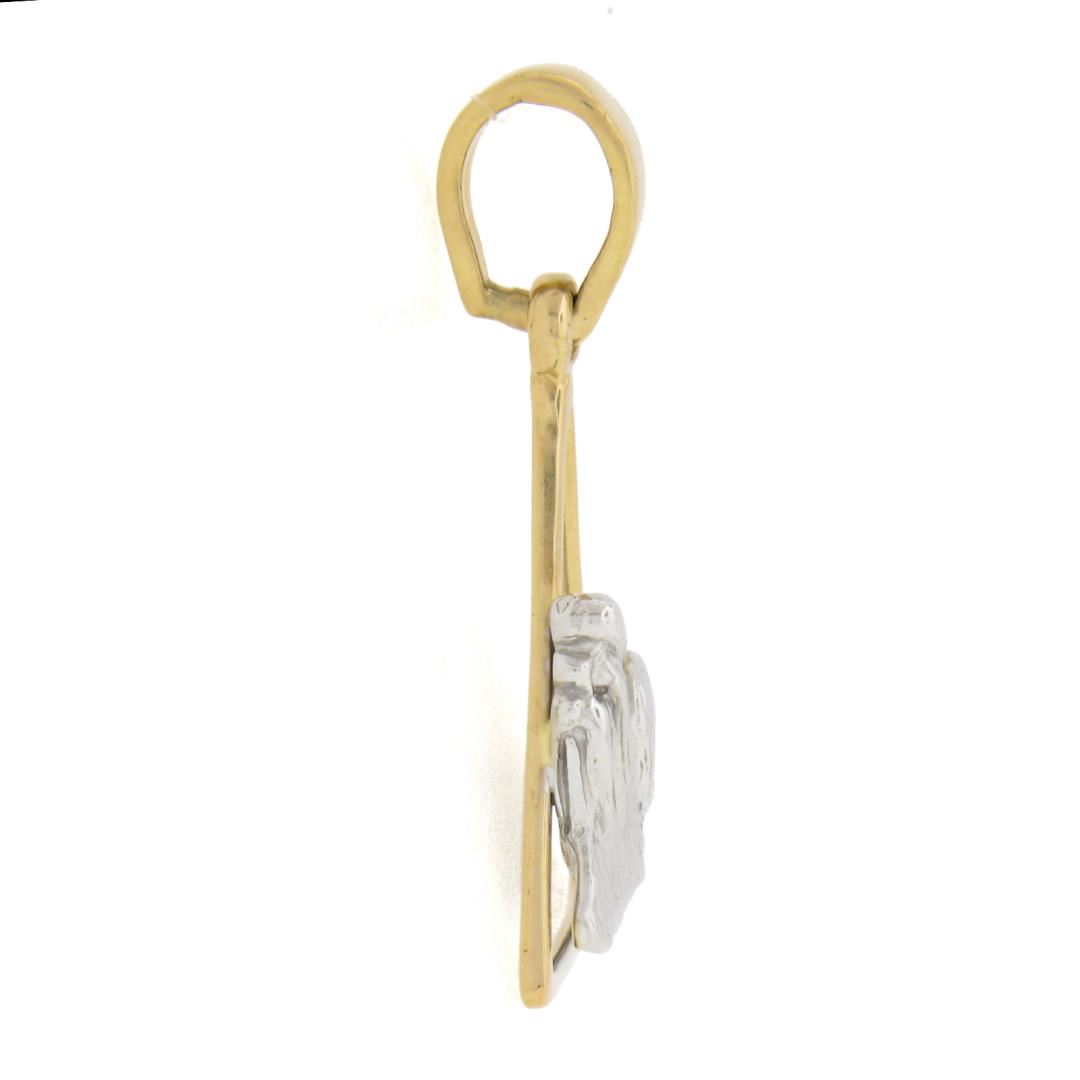 A solid 14k yellow & white gold charm pendant. The pendant weighs a total of 6.74 grams, measures 40.6x23.8mm including the bail, and the inside of the bail measures 7.1x6.7mm.