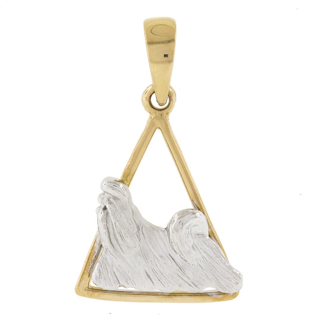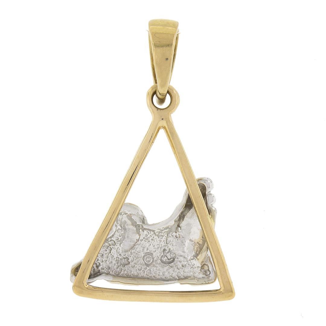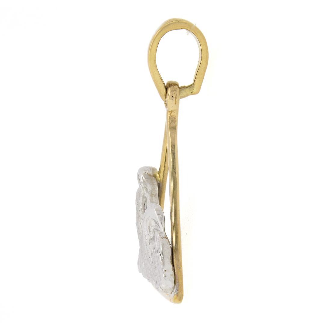 A solid 14k yellow & white gold charm pendant. The pendant weighs a total of 6.74 grams, measures 40.6x23.8mm including the bail, and the inside of the bail measures 7.1x6.7mm.