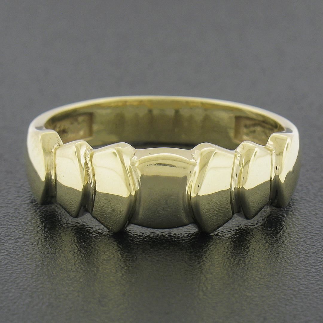 A solid 14k yellow gold pyramid band ring. The ring is size 8.0, weighs a total of 3.60 grams, and measures 6.8mm wide.