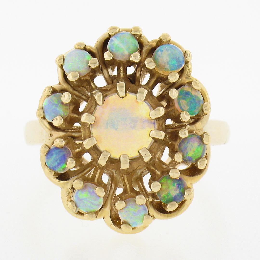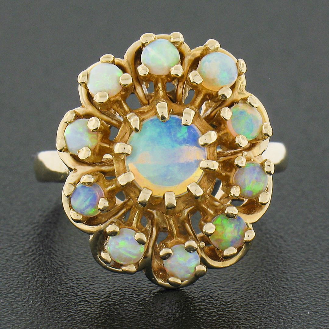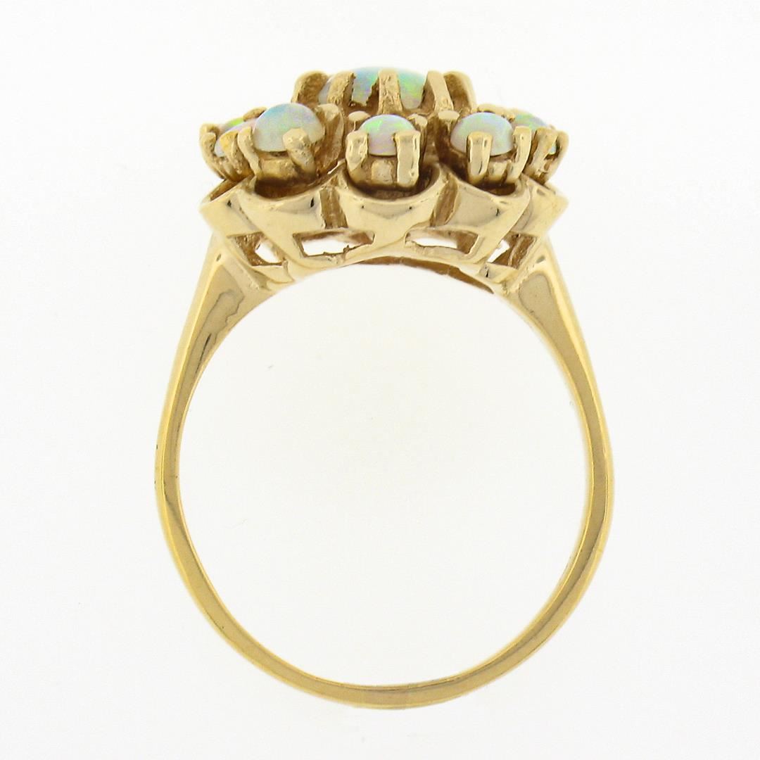 A solid 14k yellow gold cluster flower ring, featuring 11 round cabochon cut natural opals (from 2.6mm to 5.4mm). The ring is size 6.5, weighs a total of 6.65 grams, and measures 17.90mm wide.