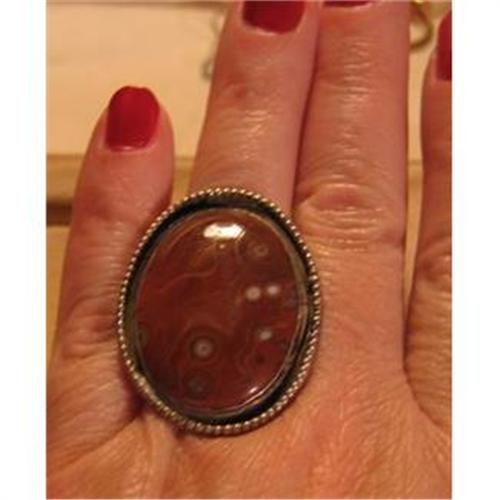 This lovely ring is made in sterling silver with a large pop Jasper stone . The ring is in excellent condition. It is a size 6 1/2. It measures 1 1/2 inches high and 1 1/8ths inches wide . It is not marked.
