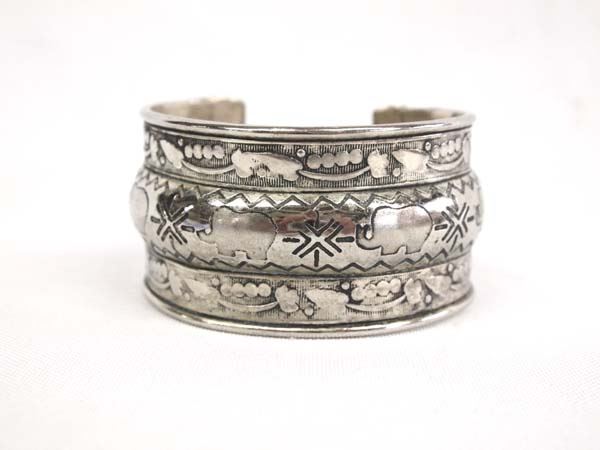 Estate Sterling Silver Elephant Cuff Bracelet, older piece of jewelry, no hallmarks, ornate with elephants surrounding bracelet, inside measures 7'' which includes opening x 1.5''W, 30.8g in total wt.